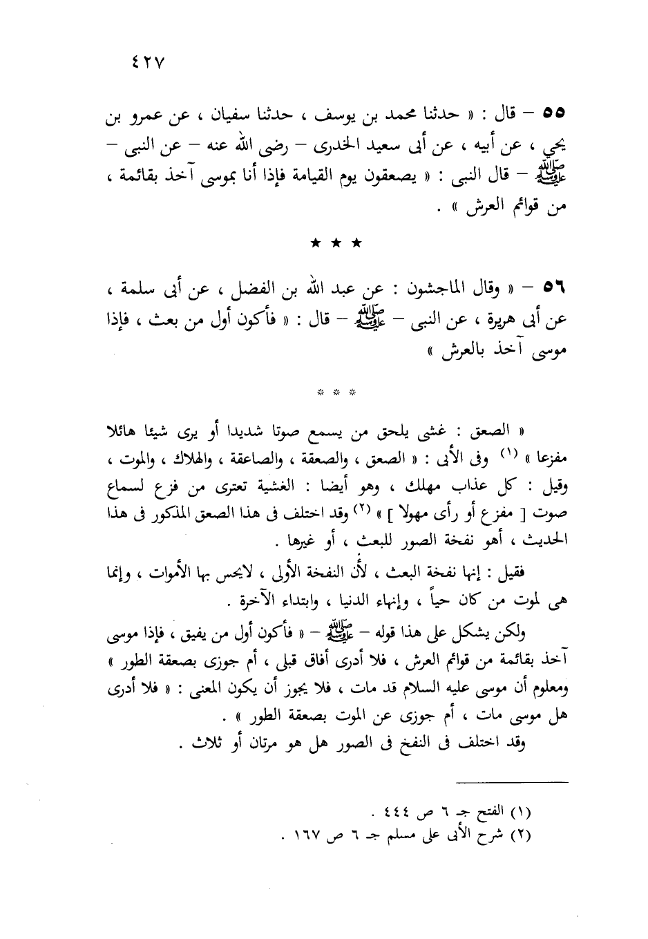 55-قال: " حدثنا محمد بن يوسف، حدثنا سفيان، عن عمرو بن يحيى، عن أبيه، عن أبي سعيد الخدري - رضي الله عنه - عن النبي -صلى الله عليه وسلم- قال النبي: " يصعقون يوم القيامة فإذا أنا بموسى آخذ بقائمة من قوائم العرش".