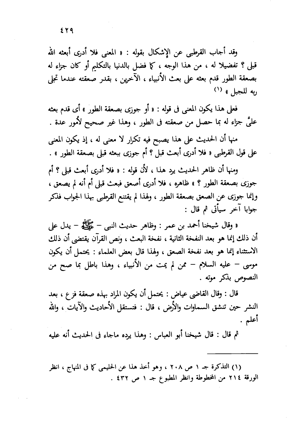 منها: أن الحديث على هذا يصبح فيه تكرار لا معنى له، إذ لا يكون المعنى على قول القرطبي: " فلا أدري أبعث قبلي؟ أو جوزي ببعثه قبلي بصعقة الطور".