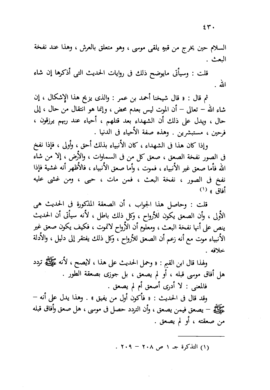 قلت: وحاصل هذا الجواب: أن الصعقة المذكورة في الحديث هي الأولى، وأن الصعق يكون للأرواح، كل ذلك باطل؛ لأنه سيأتي أن الحديث ينص على أنها نفخة البعث، ومعلوم أن الأرواح لا تموت، فكيف يكون صعق غير الأنبياء موت مع أنه زعم أن الصعق للأرواح، وكل ذلك يفتقر إلى دليل، والأدلة خلافه.