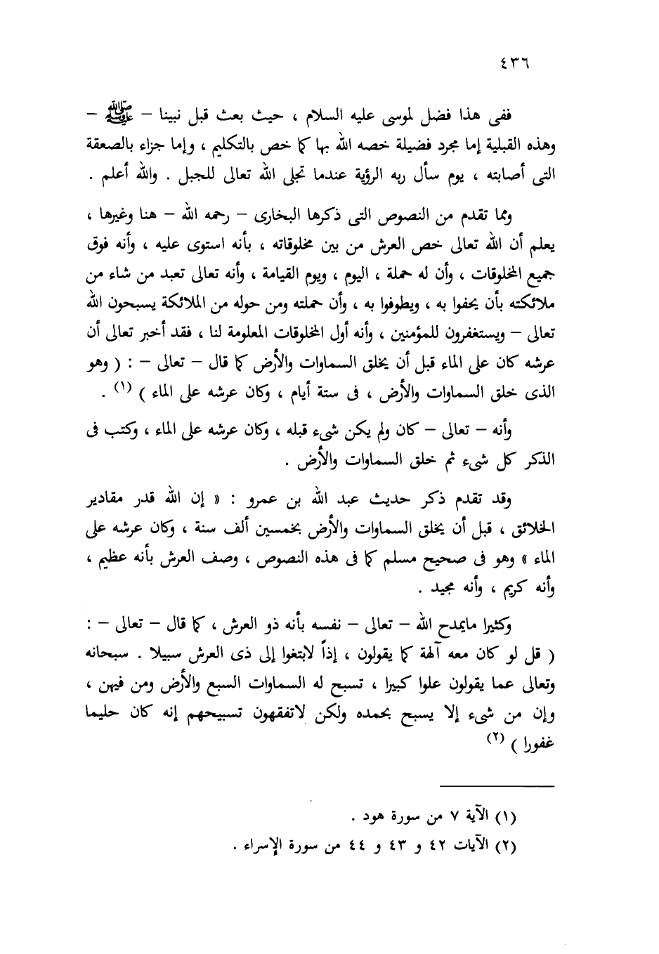 ومما تقدم من النصوص التي ذكرها البخاري – رحمه الله – هنا وغيرها، يعلم أن الله -تعالى- خص العرش من بين مخلوقاته، بأنه استوى عليه، وأنه فوق جميع المخلوقات، وأنه له حملة، ويوم القيامة، وأنه -تعالى- تعبد من شاء من ملائكته بأن يحفوا به، ويطوفوا به، وأن حملته ومن حوله من الملائكة يسبحون الله -تعالى- ويستغفرون للمؤمنين، وأنه أول المخلوقات المعلومة لنا، فقد أخبر تعالى أن عرشه كان على الماء قبل أن يخلق السماوات والأرض، كما قال -تعالى-: {وهو الذي خلق السماوات والأرض في ستة أيام وكان عرشه على الماء} (¬1) .