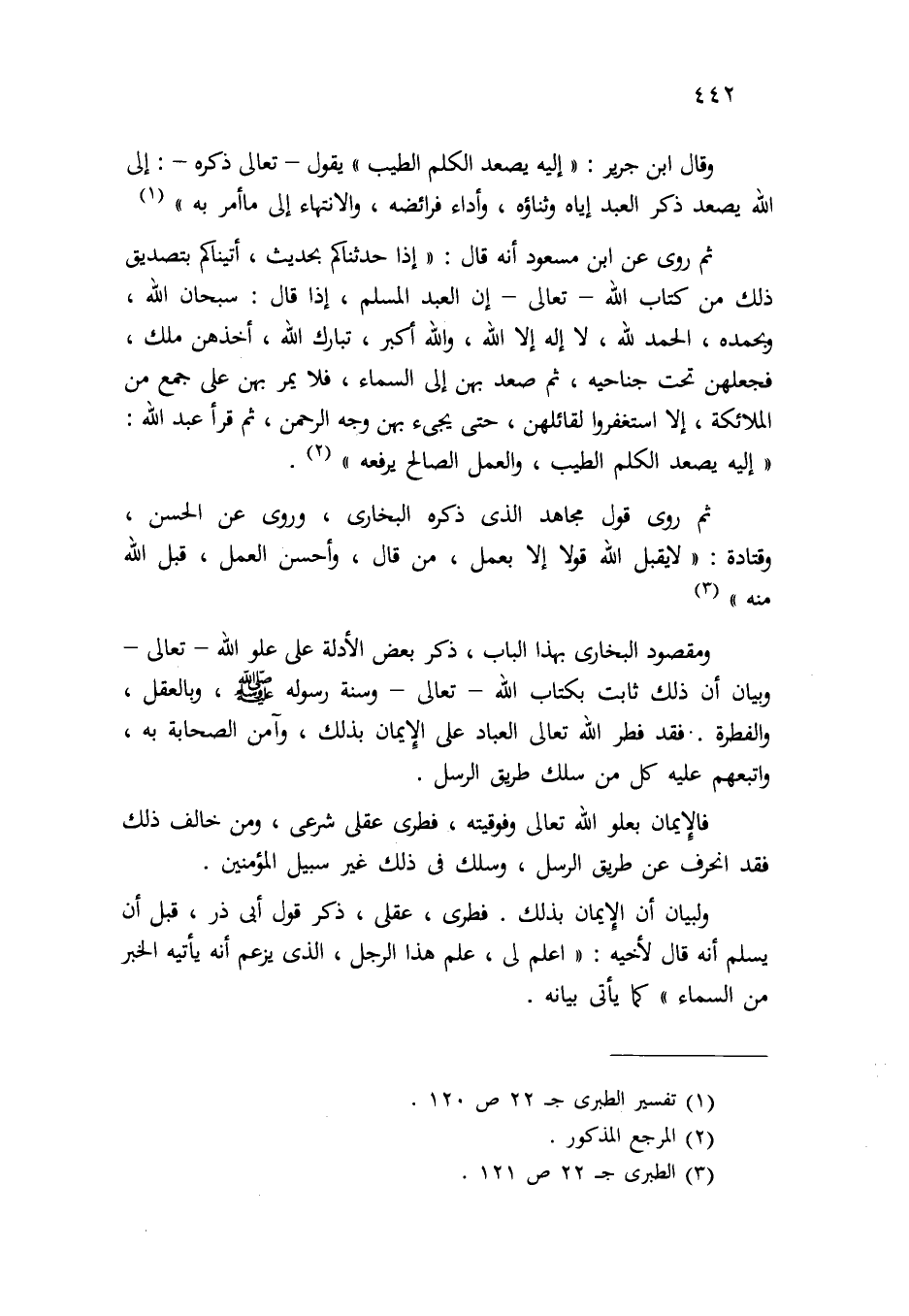 وقال ابن جرير: {إليه يصعد الكلم الطيب} يقول -تعالى ذكره -: إلى الله يصعد ذكر العبد إياه وثناؤه، وأداء فرائضه، والانتهاء إلى ما أمر به " (¬1)