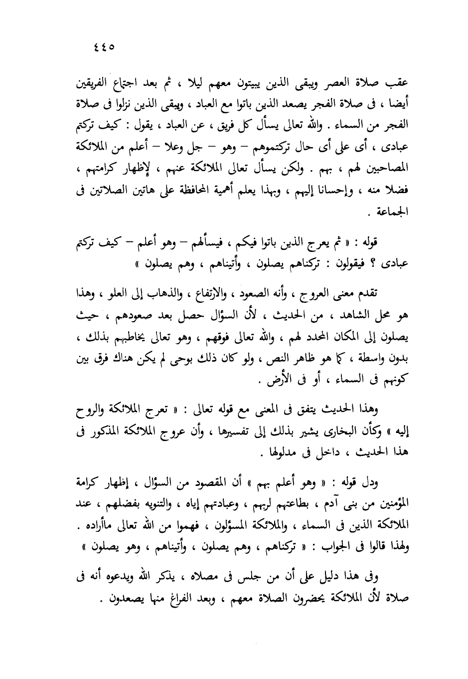 قوله: " ثم يعرج الذين باتوا فيكم، فيسألهم – وهو أعلم – كيف تركتم عبادي؟ فيقولون: تركناهم يصلون، وأتيناهم، وهم يصلون".