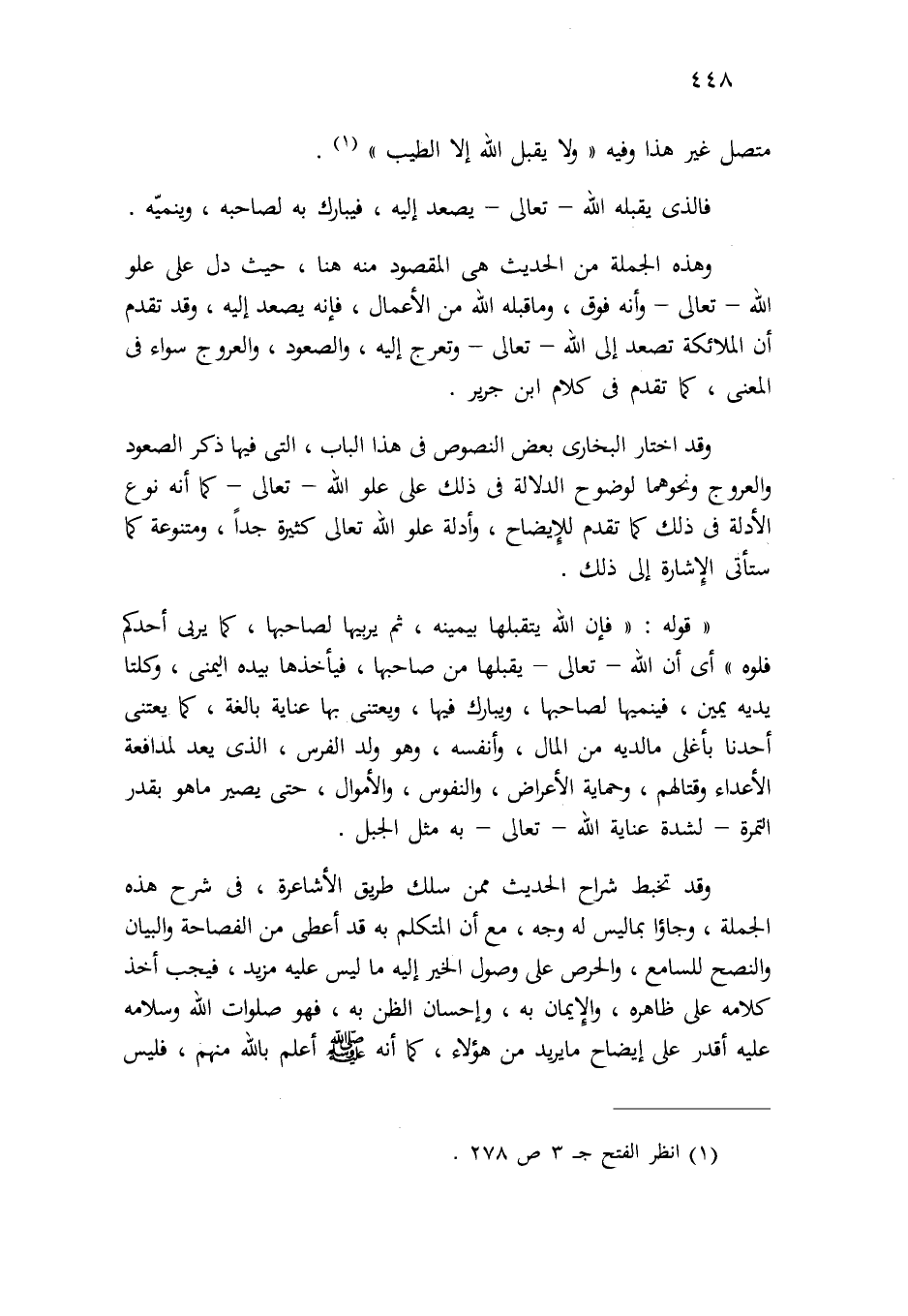 وهذه الجملة من الحديث هي المقصود منه هنا، حيث دل على علو الله -تعالى- وأنه فوق، وما قبله الله من الأعمال، فإنه يصعد إليه، وقد تقدم أن الملائكة تصعد إلى الله -تعالى- وتعرج إليه، والصعود والعروج سواء في المعنى، كما تقدم في كلام ابن جرير.
