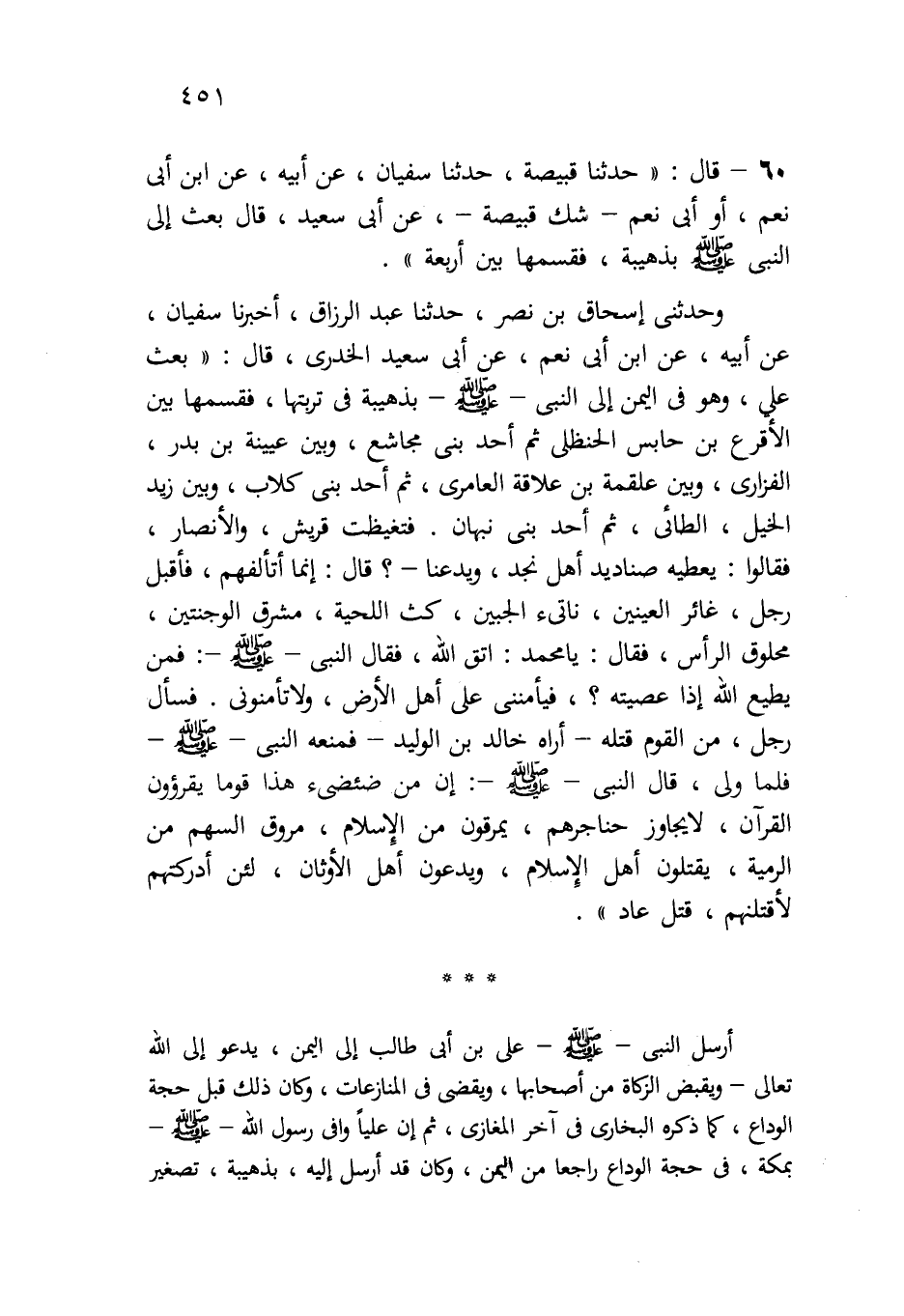 وحدثني إسحاق بن نصر، حدثنا عبد الرزاق، أخبرنا سفيان، عن أبيه، عن ابن أبي نعم، عن أبي سعيد الخدري، قال: " بعث علي، وهو في اليمن، إلى النبي –صلى الله عليه وسلم- بذهيبة في تربتها، فقسمها بين الأقرع بن حابس الحنظلي، ثم أحد بني مجاشع، وبين عيينة بن بدر الفزاري، وبين علقمة بن علاثة العامري، ثم أحد بني كلاب، وبين زيد الخيل الطائي، ثم أحد بني نبهان، فتغيظت قريش، والأنصار، فقالوا: يعطيه صناديد أهل نجد، ويدعنا –؟ قال: " إنما أتألفهم"، فأقبل رجل، غائر العينين، ناتيء الجبين، كث اللحية، مشرف الوجنتين، محلوق الرأس، فقال: يا محمد: اتق الله، فقال النبي –صلى الله عليه وسلم-: " فمن يطيع الله إذا عصيته؟ فيأمنني على أهل الأرض، ولا تأمنوني؟ " فسأل رجل من القوم قتله – أراه خالد بن الوليد – فمنعه النبي –صلى الله عليه وسلم- فلما ولى، قال النبي –صلى الله عليه وسلم-: " إن من ضئضئ هذا قوماً يقرؤون القرآن، لا يجاوز حناجرهم، يمرقون من الإسلام مروق السهم من الرمية، يقتلون أهل الإسلام، ويعدون أهل الأوثان لئن أدركتهم لأقتلنهم قتل عاد ".