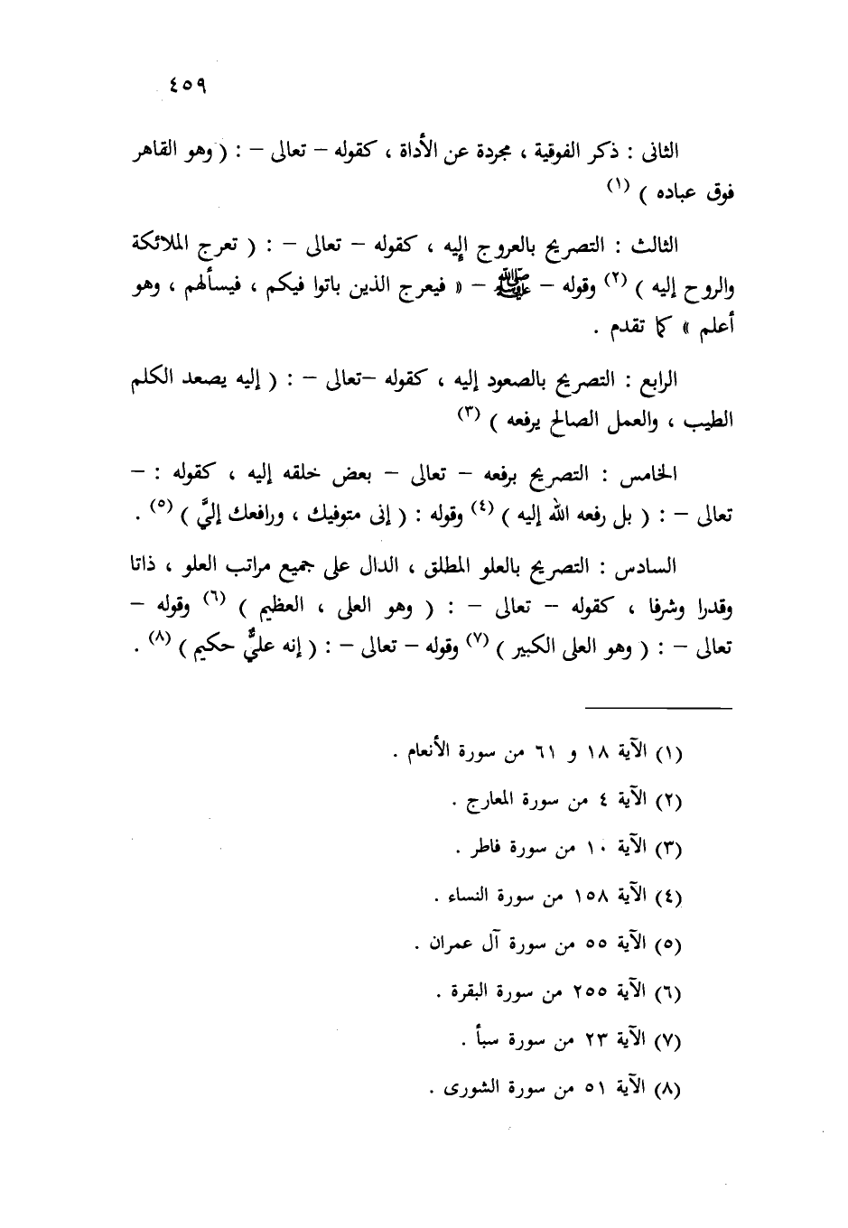 الخامس: التصريح برفعه -تعالى- بعض خلقه إليه، كقوله -تعالى-: {بَل رَّفَعَهُ اللهُ إِلَيْهِ} (¬4) ، وقوله: {إني متوفيك ورافعك} (¬5) .