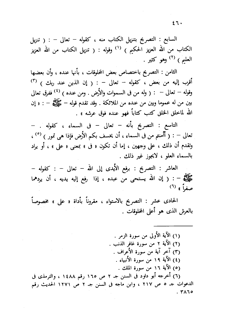 الثامن: التصريح باختصاص بعض المخلوقات، بأنها عنده، وأن بعضها أقرب إليه من بعض، كقوله -تعالى-: {إن الذين عند ربك} (¬3) ، وقوله -تعالى-: {وله من في السموات والأرض ومن عنده} (¬4) ، ففرق تعالى بين من عنده عموماً، وبين من عنده من الملائكة، وقد تقدم قوله -صلى الله عليه وسلم-: " إن الله لما خلق الخلق كتب كتاباً، فهو عنده فوق عرشه".
