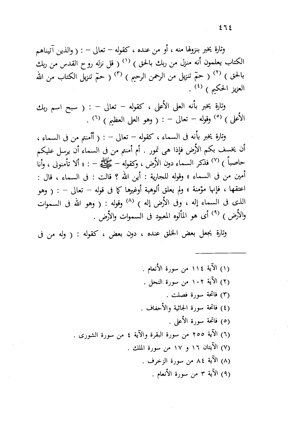 وتارة يخبر بأنه في السماء، كقوله -تعالى- أَأَمِنتُم مَّن فِي السَّمَاء أَن يَخْسِفَ بِكُمُ الأَرْضَ فَإِذَا هِيَ تَمُورُ {16} أَمْ أَمِنتُم مَّن فِي السَّمَاء أَن يُرْسِلَ عَلَيْكُمْ حَاصِبًا فَسَتَعْلَمُونَ كَيْفَ نَذِيرِ (¬7) ، فذكر السماء دون الأرض، وكقوله -صلى الله عليه وسلم-: " ألا تأمنوني، وأنا أمين من في السماء؟ " وقوله للجارية: " أين الله؟ " قالت: في السماء، قال: " اعتقها، فإنها مؤمنة" ولم يعلق ذلك بألوهية أو غيرها، كما في قوله -تعالى- وهو الذي في السماء إله وفي الأرض إله (¬8) ، وقوله: وهو الله في السماوات وفي الأرض (¬9) ، أي: هو المألوه المعبود في السموات والأرض.