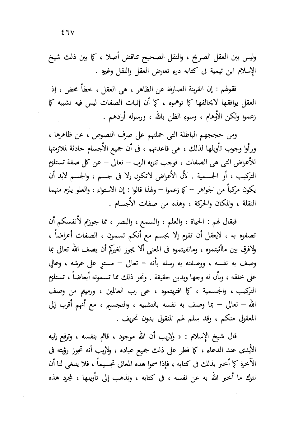 قال شيخ الإسلام: " ولا ريب أن الله موجود، قائم بنفسه، وترفع إليه الأيدي عند الدعاء، كما فطر على ذلك جميع عباده، ولا ريب أنه تجوز رؤيته في الآخرة، كما أخبر بذلك في كتابه، فإذا سموا هذه المعاني تجسيماً، فلا ينبغي لنا أن نترك ما أخبر الله به عن نفسه في كتابه، ونذهب إلى تأويلها، لمجرد هذه