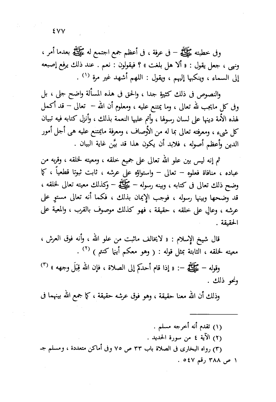 قال شيخ الإسلام: " لا يخالف ما ثبت من علو الله، وأنه فوق العرش، معيته لخلقه، الثابت بمثل قوله: {وَهُوَ مَعَكُمْ أَيْنَ مَا كُنتُمْ} (¬2) .