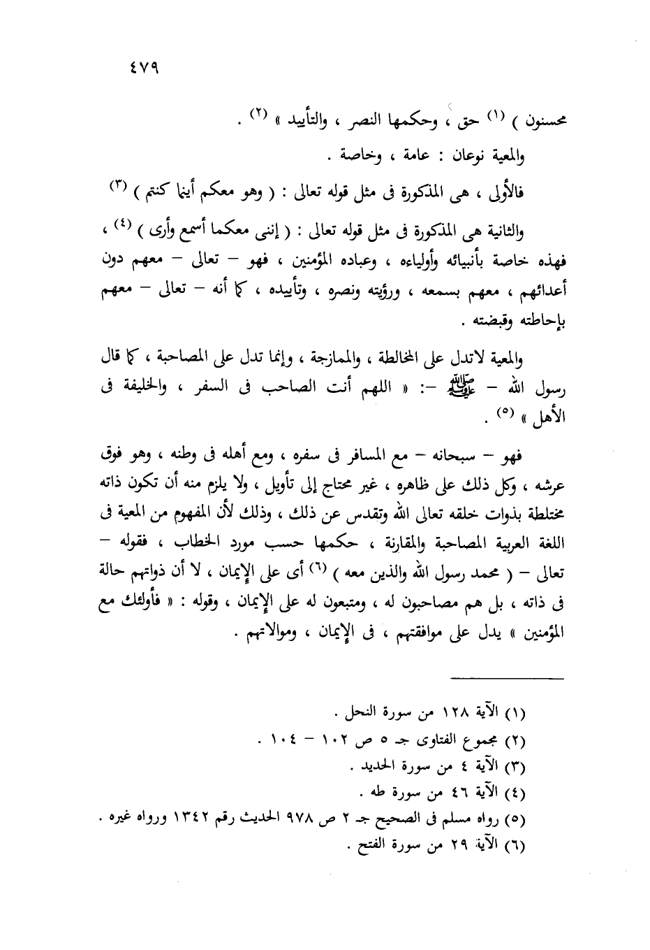 فهو - سبحانه - مع المسافر في سفره، ومع أهله في وطنه، وهو فوق عرشه، وكل ذلك على ظاهره، غير محتاج إلى تأويل، ولا يلزم منه أن تكون ذاته مختلطة بذوات خلقه -تعالى الله وتقدس عن ذلك -؛ وذلك لأن المفهوم من المعية في اللغة العربية: المصاحبة والمقارنة، حكمها حسب مورد الخطاب، فقوله -تعالى-: {مُّحَمَّدٌ رَّسُولُ اللَّهِ وَالَّذِينَ مَعَهُ} (¬6) أي: على الإيمان، لا أن ذواتهم حالة في ذاته، بل هم مصاحبون له ومتبعون له على الإيمان، وقوله: {فَأُوْلَئِكَ مَعَ الْمُؤْمِنِينَ} يدل على موافقتهم في الإيمان، وموالاتهم.