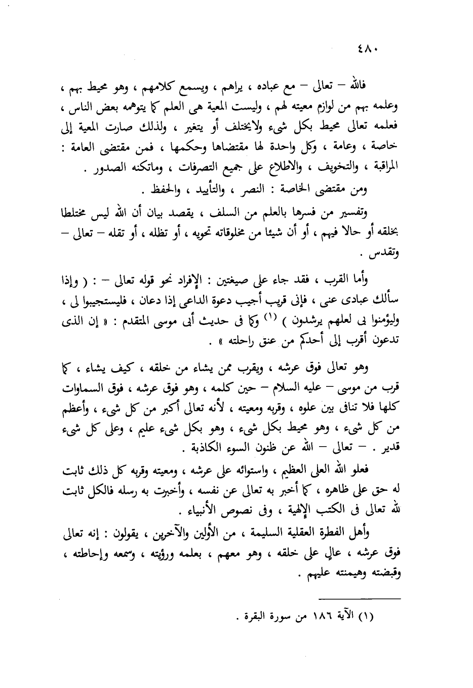 فعلو الله العلي العظيم، واستواؤه على عرشه، ومعيته وقربه، كل ذلك ثابت له، حق على ظاهره، كما أخبر به -تعالى- عن نفسه، وأخبرت به رسله، فالكل ثابت لله -تعالى- في الكتب الإلهية، وفي نصوص الأنبياء.