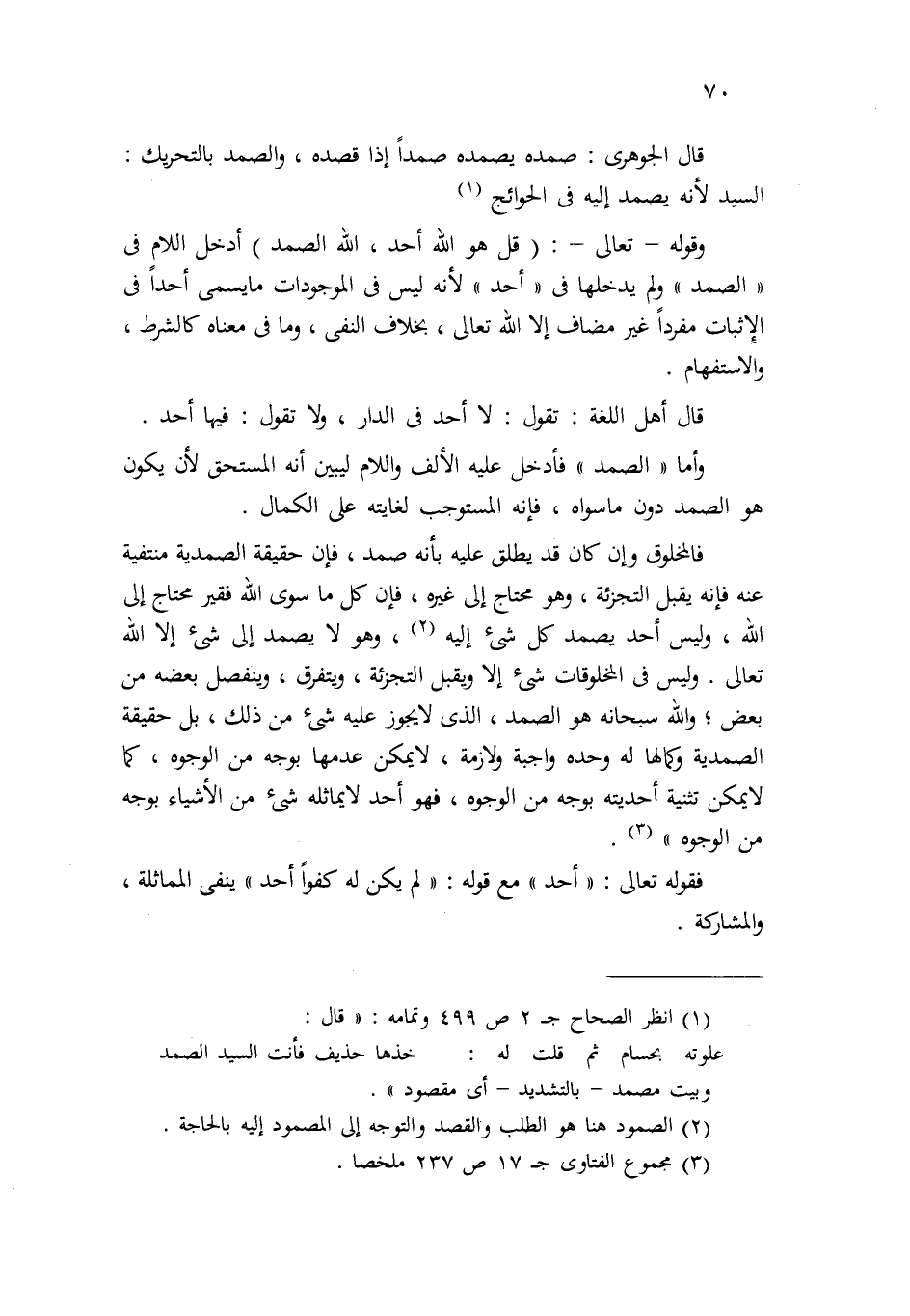 فالمخلوق وإن كان قد يطلق عليه بأنه صمد، فإن حقيقة الصمدية منتفية عنه، فإنه يقبل التجزئة، وهو محتاج إلى غيره، فإن كل ما سوى الله فقير محتاج إلى الله، وليس أحد يصمد كل شيء إليه (¬3) وهو لا يصمد إلى شيء إلا الله –تعالى-. وليس في المخلوقات شيء إلا ويقبل التجزئة، ويتفرق، وينفصل بعضه من بعض؛ والله سبحانه هو الصمد، الذي لا يجوز عليه شيء من ذلك، بل حقيقة الصمدية وكمالها له وحده واجبة ولازمة، لا يمكن عدمها بوجه من الوجوه، كما لا يمكن تثنية أحديته بوجه من الوجوه؛ فهو أحد لا يماثله شيء من الأشياء بوجه من الوجوه" (¬4) .