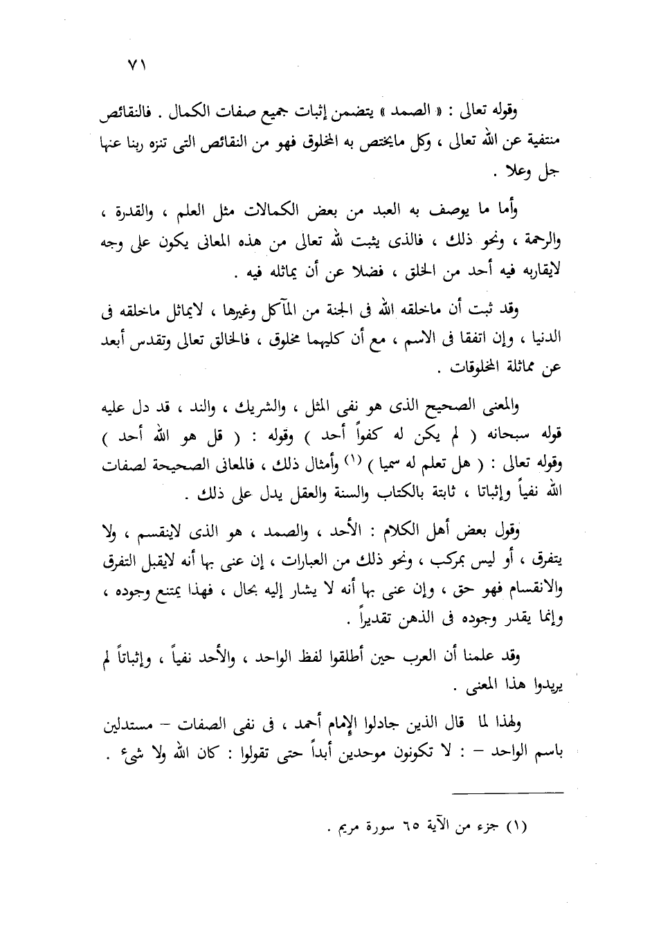 والمعنى الصحيح الذي هو نفي المثل، والشريك، والند، قد دل عليه قوله- سبحانه-: {وَلَمْ يَكُن لَّهُ كُفُوًا أَحَدٌ} (¬1) ، وقوله: {قُلْ هُوَ اللَّهُ أَحَدٌ} (¬2) .