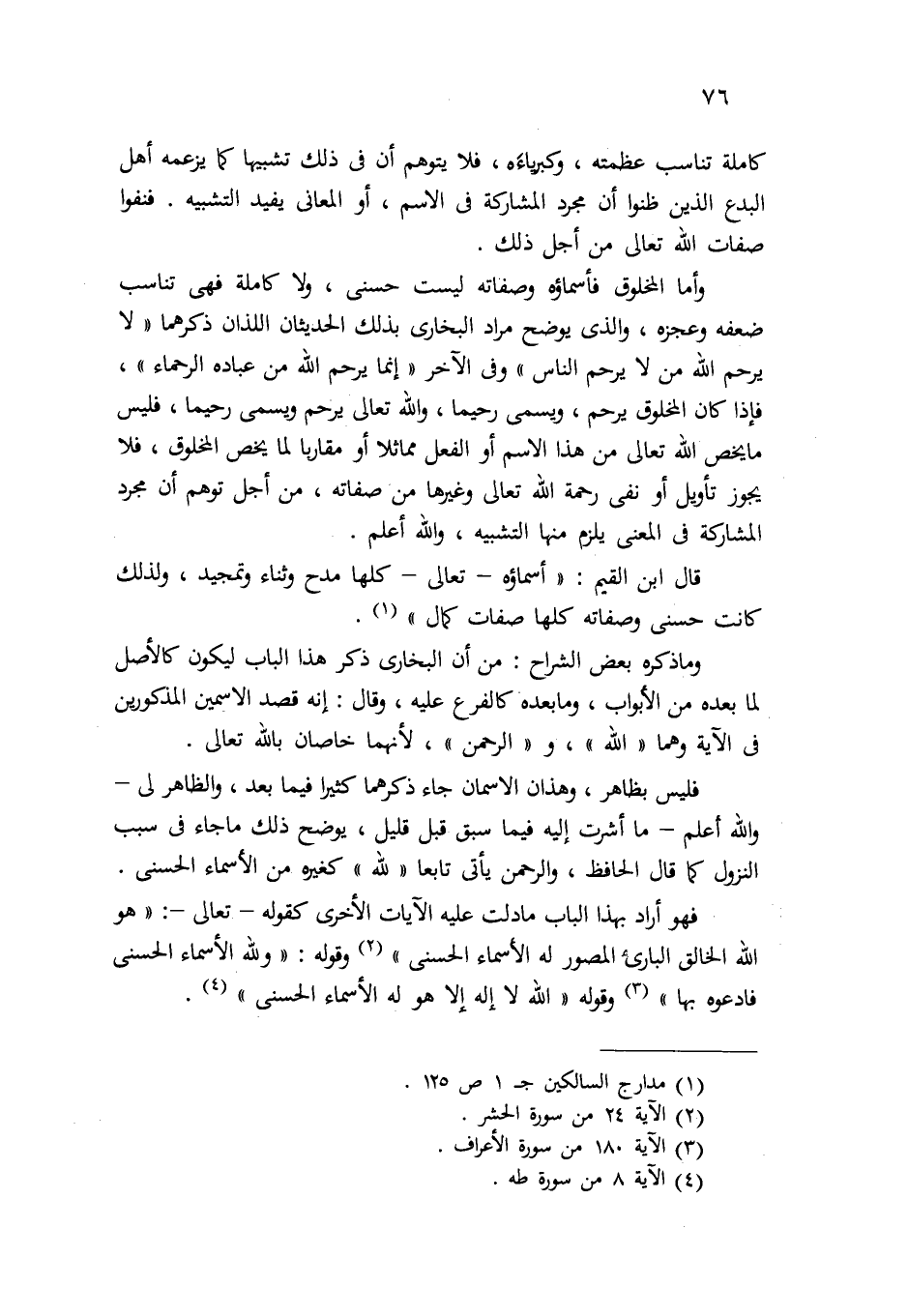وأما المخلوق فأسماؤه وصفاته ليست حسنى، ولا كاملة، فهي تناسب ضعفه وعجزه، والذي يوضح مراد البخاري بذلك الحديثان اللذان ذكرهما"لا يرحم من لا يرحم الناس"، وفي الآخر "إنما يرحم الله من عباده الرحماء"، فإذا كان المخلوق يرحم، ويسمى رحيماً، والله-تعالى- يرحم ويسمى رحيماً، فليس ما
