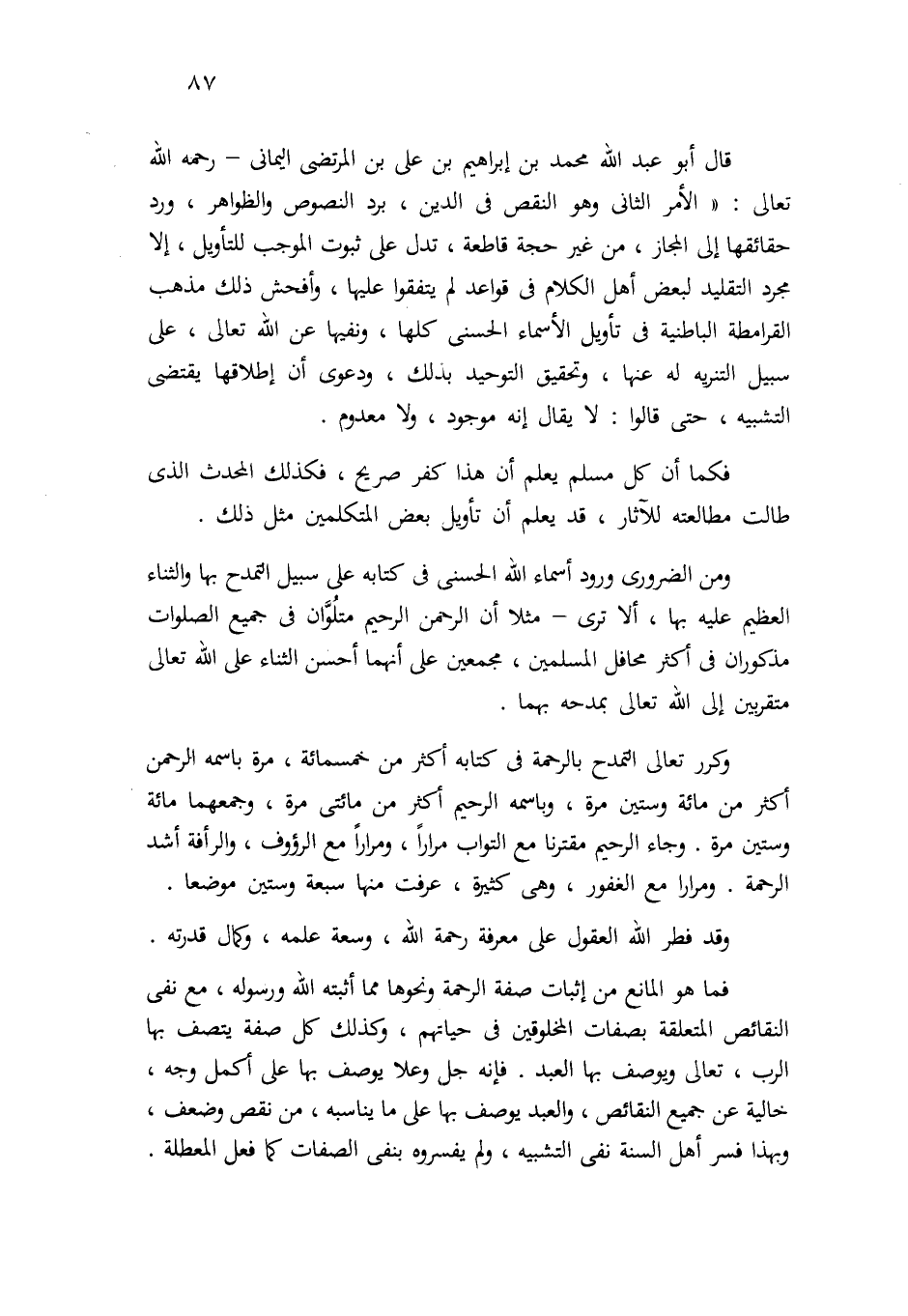 فما هو المانع من إثبات صفة الرحمة ونحوها مما أثبته الله ورسوله، مع نفي النقائص المتعلقة بصفات المخلوقين في حياتهم، وكذلك كل صفة يتصف بها الرب-تعالى- ويوصف بها العبد. فإنه –جل وعلا- يوصف بها على أكمل وجه، خالية عن جميع النقائص، والعبد يوصف بها على ما يناسبه، من نقص وضعف، وبهذا فسر أهل السنة نفي التشبيه، ولم يفسروه بنفي الصفات كما فعل المعطلة.