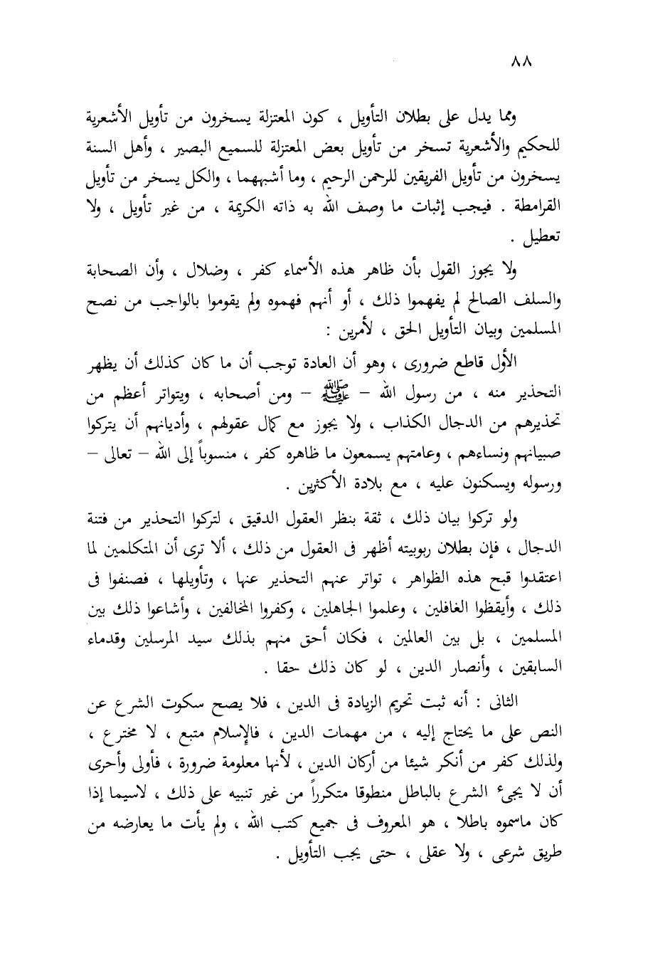 ولو تركوا بيان ذلك، ثقة بنظر العقول الدقيق، لتركوا التحذير من فتنة الدجال، فإن بطلان ربوبيته أظهر في العقول من ذلك، ألا ترى أن المتكلمين لما اعتقدوا قبح هذه الظواهر، تواتر عنهم التحذير عنها، وتأويلها، فصنفوا في ذلك، وأيقظوا الغافلين، وعلموا الجاهلين، وكفروا المخالفين، وأشاعوا ذلك بين المسلمين، بل بين العالمين، فكان أحق منهم بذلك سيد المرسلين وقدماء السابقين، وأنصار الدين، لو كان ذلك حقاً.