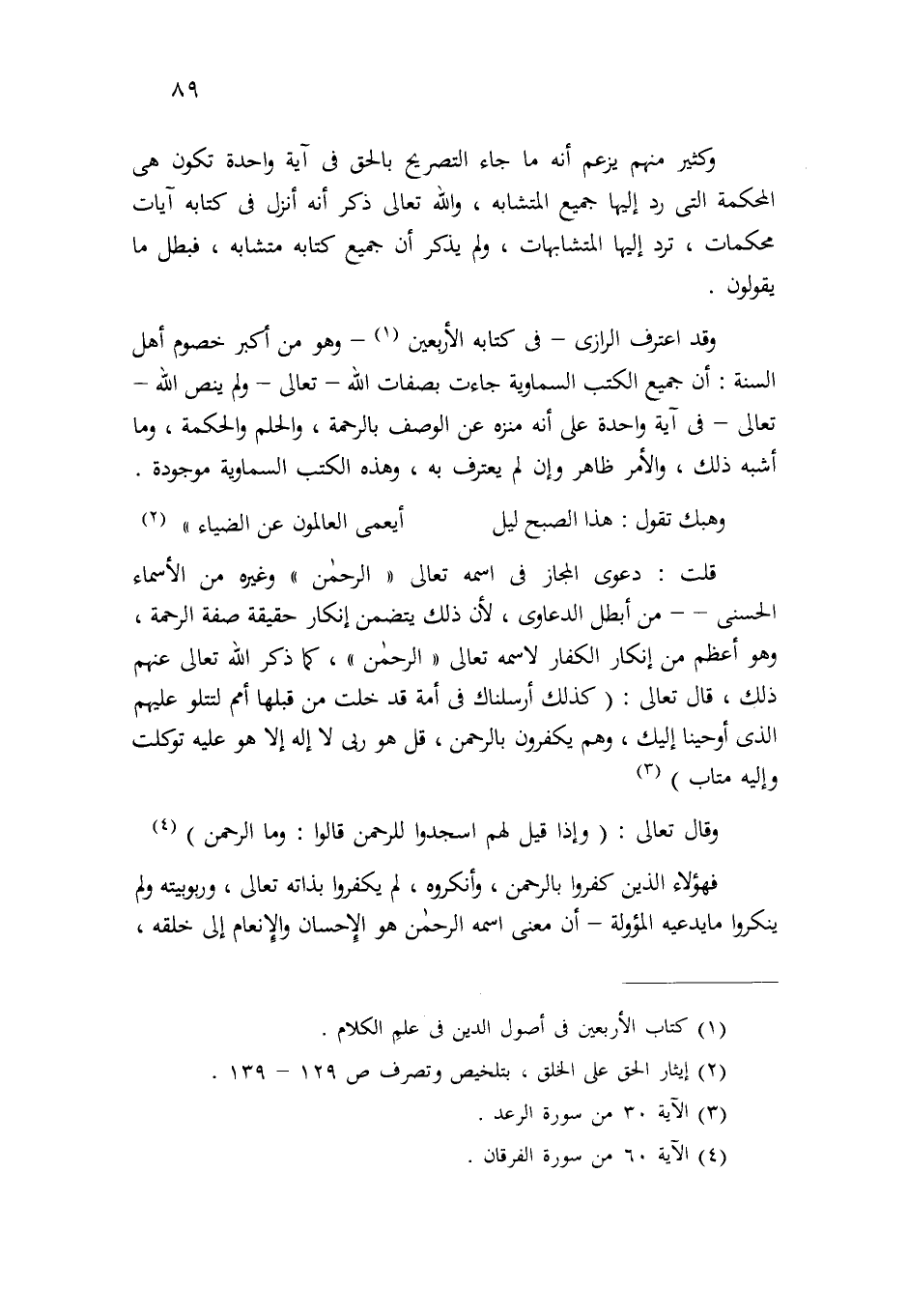 وقد اعترف الرازي- في كتابه "الأربعين" (¬1) - وهو من أكبر خصوم أهل السنة- أن جميع الكتب السماوية جاءت بصفات الله –تعالى- ولم ينص الله-تعالى- في آية واحدة على أنه منزه عن الوصف بالرحمة والحلم والحكمة، وما أشبه ذلك. والأمر ظاهر وإن لم يعترف به، وهذه الكتب السماوية موجودة.