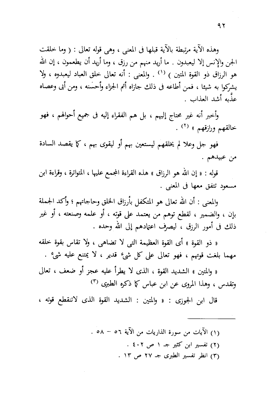 و {الْمَتِينُ} الشديد القوة، الذي لا يطرأ عليه عجز أو ضعف، تعالى وتقدس، وهذا المروي عن ابن عباس كما ذكره الطبري (¬3) .