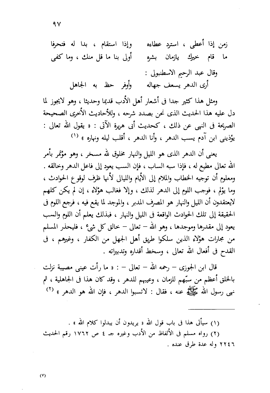ومعلوم أن توجيه الخطاب والملام إلى الأيام والليالي لأنها ظرف لوقوع الحوادث، وما يؤلم، فوجه اللوم إلى الدهر لذلك، وإلا فغالب هؤلاء، إن لم يكن كلهم، لا يعتقدون أن الليل والنهار هو المصرف المدبر، والموجد لما يقع فيه، فرجع اللوم في الحقيقة إلى تلك الحوادث الواقعة في الليل والنهار، فبذلك يعلم أن اللوم والسب يعود إلى مقدرها وموجدها، وهو الله-تعالى- خالق كل شيء، فليحذر المسلم من مجاراة هؤلاء الذين سلكوا طريق أهل الجهل من الكفار، وغيرهم، في القدح في أفعال الله –تعالى-، وسخط أقداره وتدبيراته.
