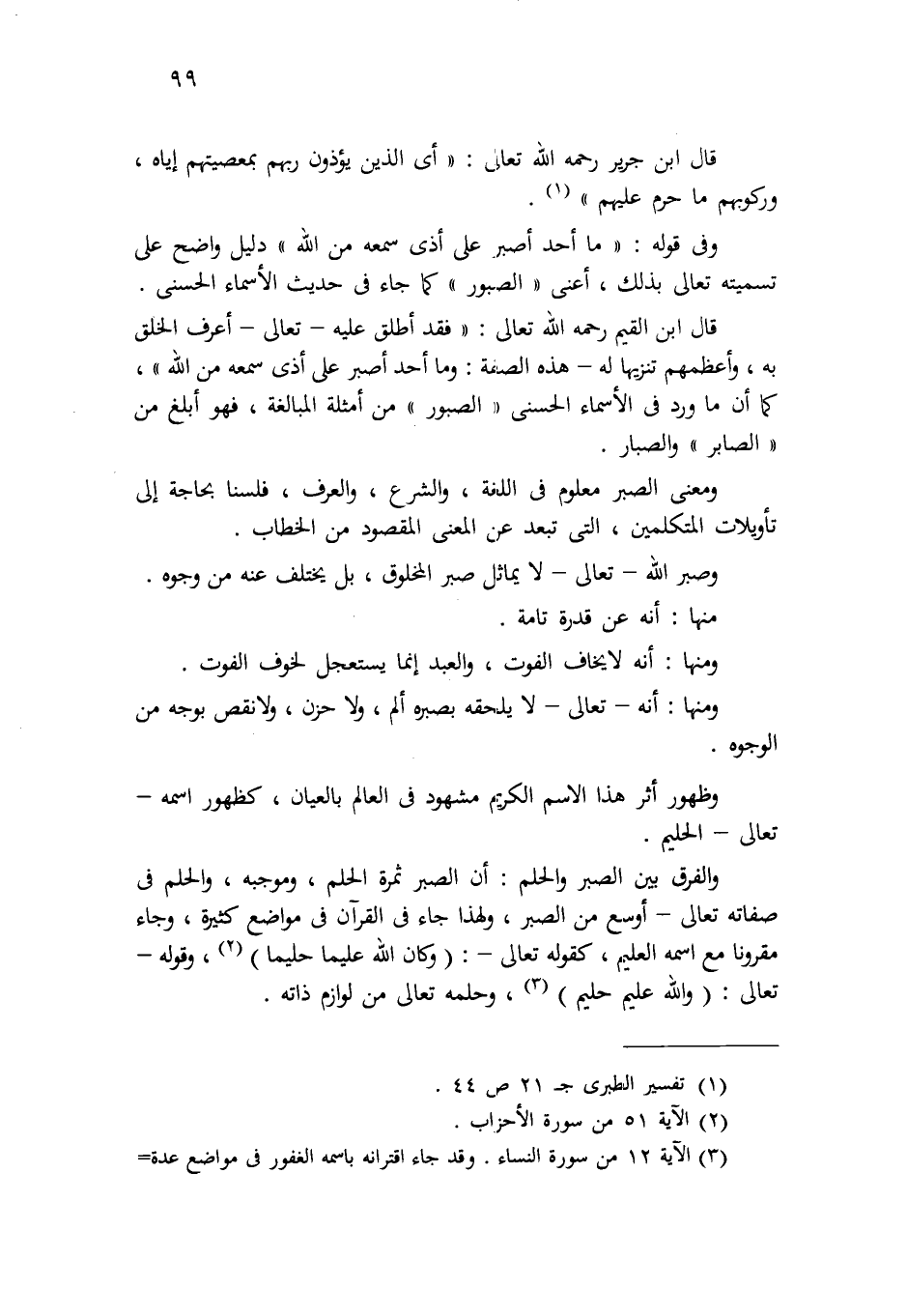 قال ابن القيم –رحمه الله تعالى-: "فقد أطلق عليه –تعالى- أعرف الخلق به، وأعظمهم تنزيهاً له، هذه الصفة: "وما أحد أصبر على أذى سمعه من الله "، كما أن ما ورد في الأسماء الحسنى "الصبور" من أمثلة المبالغة، فهو أبلغ من "الصابر" والصبار. ومعنى الصبر معلوم في اللغة، والشرع، والعرف، فلسنا بحاجة إلى تأويلات المتكلمين، التي تبعد عن المعنى المقصود من الخطاب.