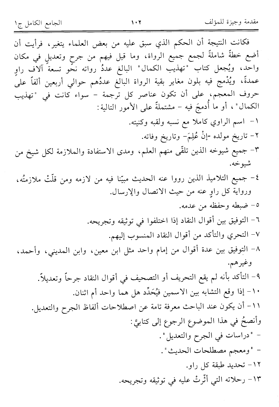 فكانت النتيجة أن الحكم الذي سبق عليه من بعض العلماء يتغير، فرأيت أن أضع خطةً شاملةً لجمع جميع الرواة، وما قيل فيهم من جرحٍ وتعديلٍ في مكان واحد، ويُجعل كتاب "تهذيب الكمال" البالغ عددُ رواته نحو تسعة آلاف راوٍ عمدةً، ويُدْمج فيه بلون مغاير بقية الرواة البالغ عددُهم حوالي أربعين ألفًا على حروف المعجم، على أن تكون عناصر كل ترجمة -سواء كانت في "تهذيب الكمال"، أو ما أُدمجَ فيه- مشتملةً على الأمور التالية: