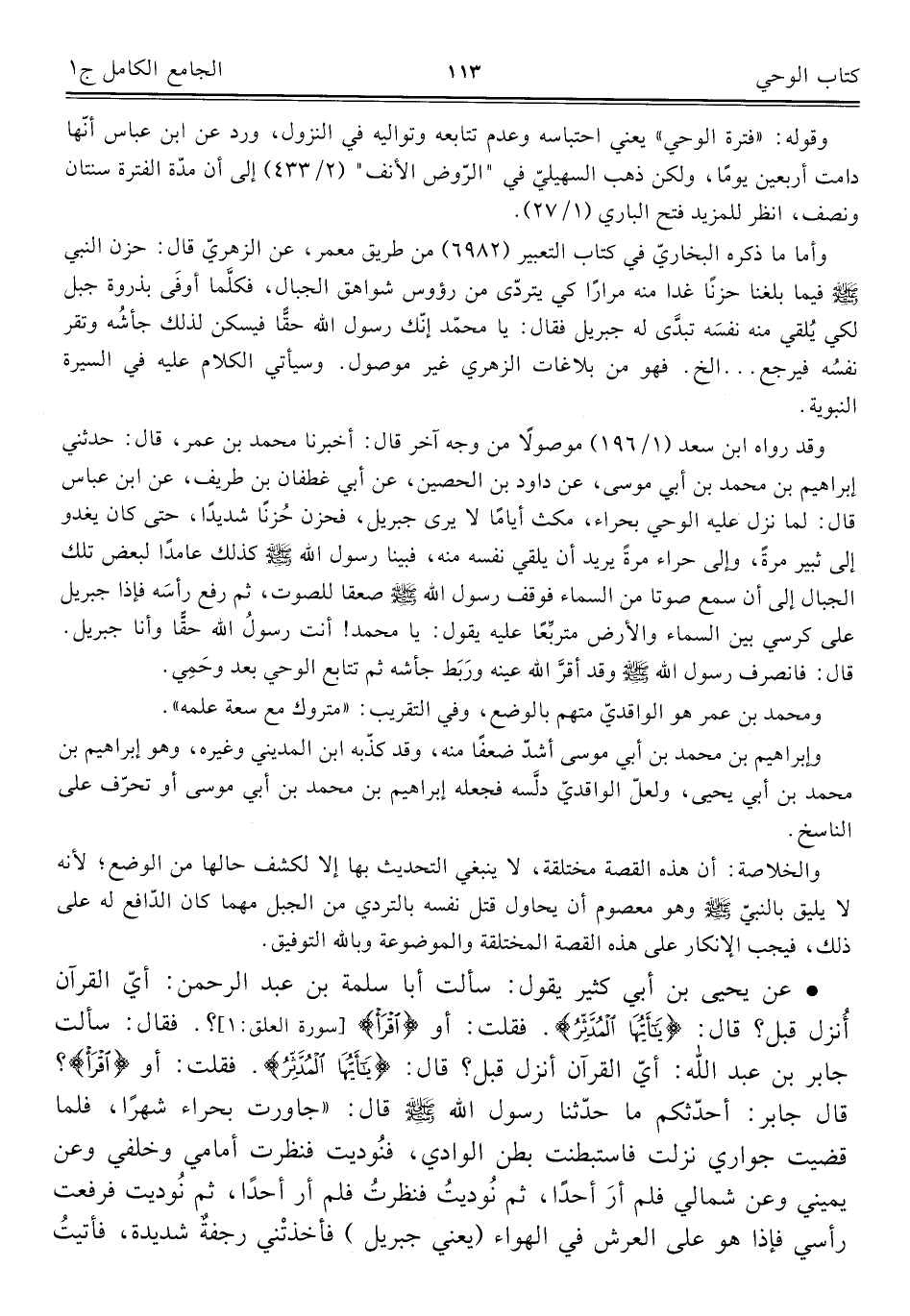 وأما ما ذكره البخاريّ في كتاب التعبير (٦٩٨٢) من طريق معمر، عن الزهريّ قال: حزن النبي -صلى اللَّه عليه وسلم- فيما بلغنا حزنًا غدا منه مرارًا كي يتردّى من رؤوس شواهق الجبال، فكلَّما أوفَى بذروة جبل لكي يُلقي منه نفسَه تبدَّى له جبريل فقال: يا محمّد إنّك رسول اللَّه حقًّا فيسكن لذلك جأشُه وتقر تفسُه فيرجع. . . الخ. فهو من بلاغات الزهري غير موصول. وسيأتي الكلام عليه في السيرة النبوية.