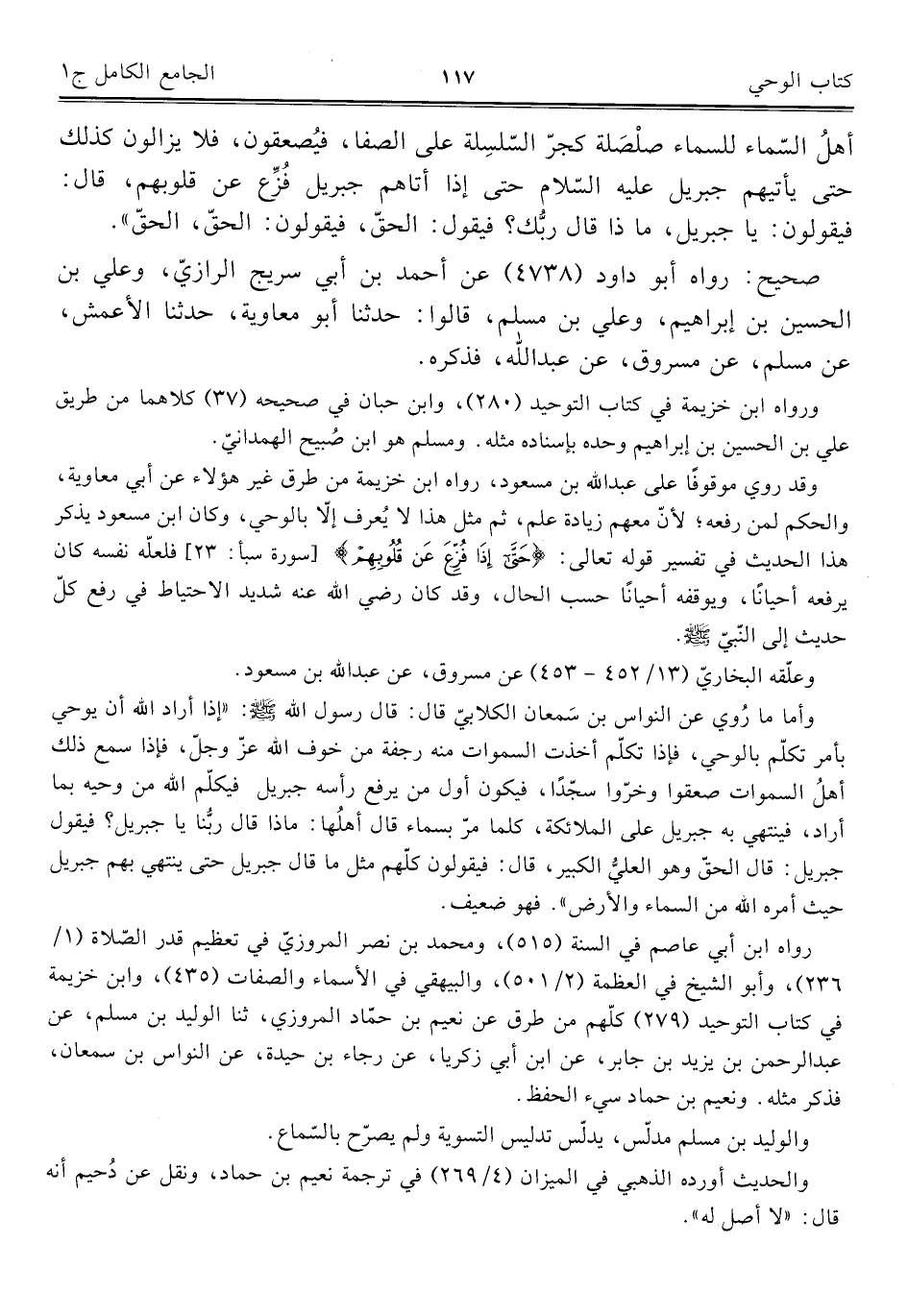 وأما ما رُوي عن النواس بن سَمعان الكلابيّ قال: قال رسول اللَّه -صلى اللَّه عليه وسلم-: "إذا أراد اللَّه أن يوحي بأمر تكلّم بالوحي، فإذا تكلّم أخذت السموات منه رجفة من خوف اللَّه عزّ وجلّ، فإذا سمع ذلك أهلُ السموات صعقوا وخرّوا سجّدًا، فيكون أول من يرفع رأسه جبريل فيكلّم اللَّه من وحيه بما أراد، فينتهي به جبريل على الملائكة، كلما مرّ بسماء قال أهلها: ماذا قال ربُّنا يا جبريل؟ فيقول جبريل: قال الحق وهو العليُّ الكبير، قال: فيقولون كلّهم مثل ما قال جبريل حتى ينتهي بهم جبريل حيث أمره اللَّه من السماء والأرض". فهو ضعيف.