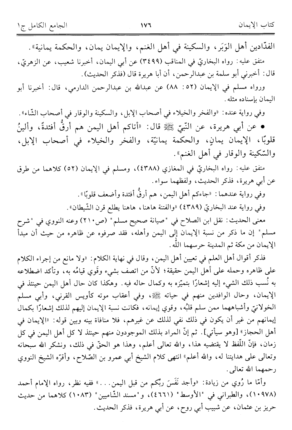 فذكر أقوال أهل العلم في تعيين أهل اليمن، وقال في نهاية الكلام: "ولا مانع من إجراء الكلام على ظاهره وحمله على أهل اليمن حقيقة؛ لأنّ من اتصف بشيء وقَوي قيامُه به، وتأكد اضطلاعه به نُسب ذلك الشيء إليه إشعارًا بتميّزه به وكمال حاله فيه، وهكذا كان حال أهل اليمن حينئذ في الإيمان، وحال الوافدين منهم في حياته -صلى اللَّه عليه وسلم-، وفي أعقاب موته كأويس القرني، وأبي مسلم الخولانيّ وأشباههما ممن سلم قلبُه، وقوي إيمانه، فكانت نسبة الإيمان إليهم لذلك إشعارًا بكمال إيمانهم من غير أن يكون في ذلك نفي لذلك عن غيرهم، فلا منافاة بينه وبين قوله: "الإيمان في أهل الحجاز" [وهو سيأتي]. ثم إنّ المراد بذلك الموجودون منهم حينئذ لا كل أهل اليمن في كل زمان، فإنّ اللّفظ لا يقتضيه هذا، واللَّه تعالى أعلم، وهذا هو الحقّ في ذلك، ونشكر اللَّه سبحانه وتعالى على هدايتنا له، واللَّه أعلم" انتهى كلام الشيخ أبي عمرو بن الصّلاح، وأقرّه الشيخ النووي رحمهما اللَّه تعالى.