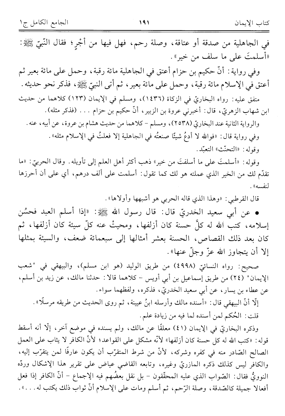 في الجاهليّة من صدقة أو عتاقة، وصلة رحم، فهل فيها من أجْرٍ؛ فقال النّبيّ -صلى اللَّه عليه وسلم-: "أسلمتَ على ما سلف من خير".