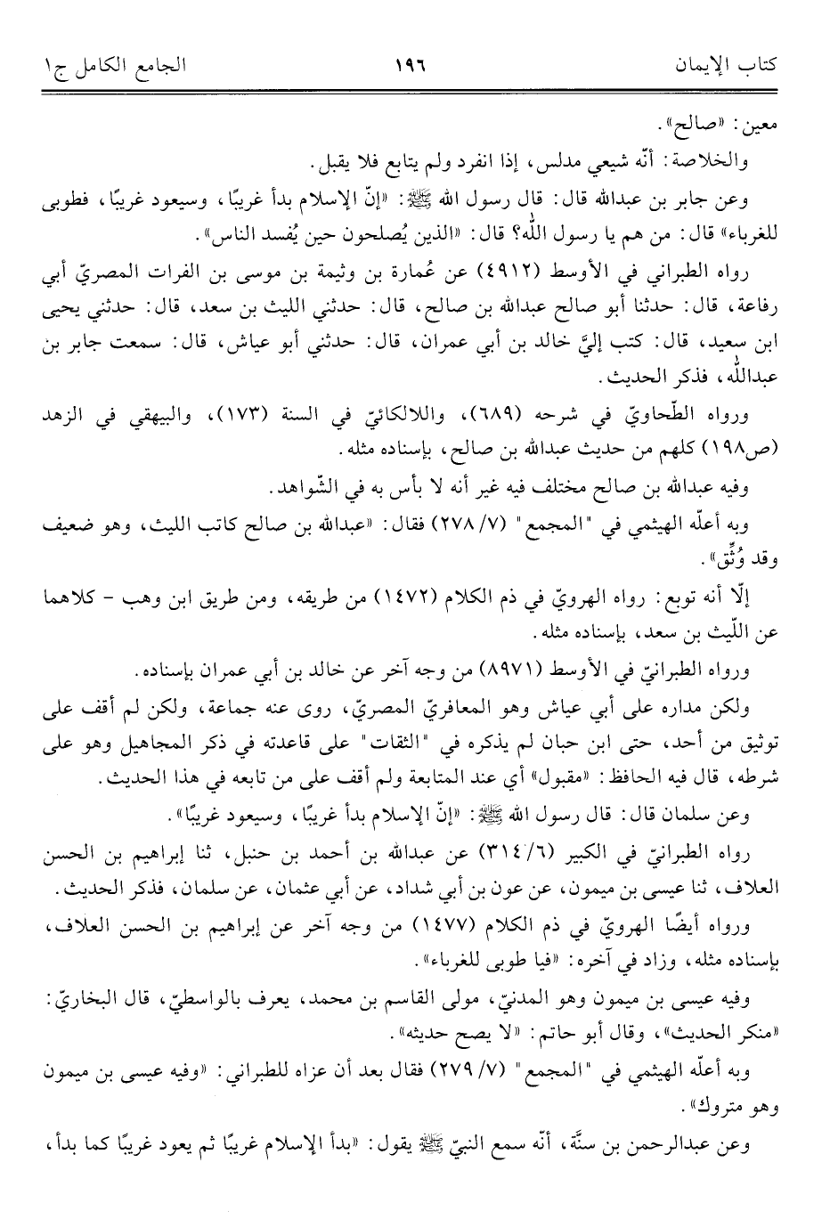 وعن جابر بن عبد اللَّه قال: قال رسول اللَّه -صلى اللَّه عليه وسلم-: "إنّ الإسلام بدأ غريبًا، وسيعود غريبًا، فطوبي للغرباء" قال: من هم يا رسول اللَّه؟ قال: الذين يُصلحون حين يُفسد الناس".