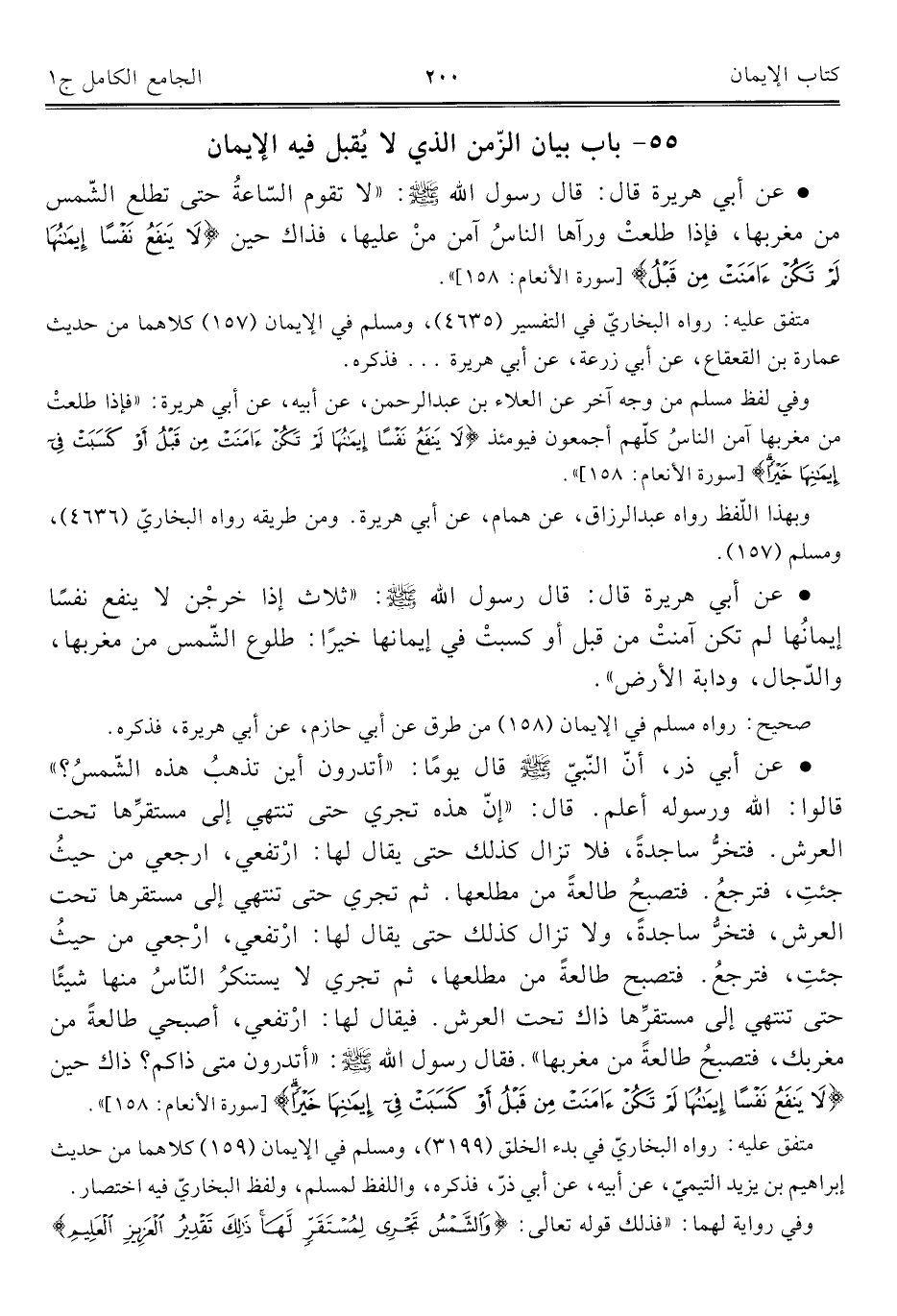 • عن أبي هريرة قال: قال رسول اللَّه -صلى اللَّه عليه وسلم-: "لا تقوم السّاعةُ حتى تطلع الشّمس من مغربها، فإذا طلعتْ ورآها الناسُ آمن منْ عليها، فذاك حين {لَا يَنْفَعُ نَفْسًا إِيمَانُهَا لَمْ تَكُنْ آمَنَتْ مِنْ قَبْلُ} [سورة الأنعام: ١٥٨] ".