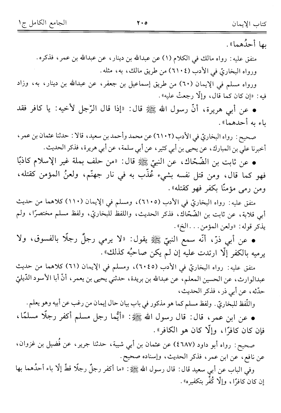 • عن ابن عمر، قال: قال رسول اللَّه -صلى اللَّه عليه وسلم-: "أيُّما رجل مسلم أكفر رجلًا مسلمًا، فإن كان كافرًا، وإلّا كان هو الكافر".