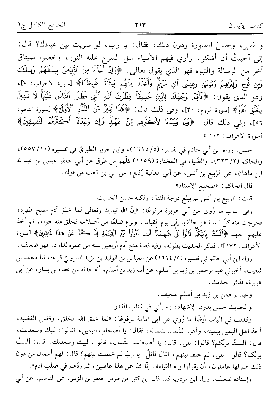والفقير، وحسَنَ الصورةِ ودون ذلك، فقال: يا ربّ، لو سويت بين عبادك؟ قال: إني أحببتُ أن أشكر، وأري فيهم الأنبياء مثل السرج عليه النور، وخصوا بميثاق آخر من الرسالة والنبوة فهو الذي يقول تعالى: {وَإِذْ أَخَذْنَا مِنَ النَّبِيِّينَ مِيثَاقَهُمْ وَمِنْكَ وَمِنْ نُوحٍ وَإِبْرَاهِيمَ وَمُوسَى وَعِيسَى ابْنِ مَرْيَمَ وَأَخَذْنَا مِنْهُمْ مِيثَاقًا غَلِيظًا} [سورة الأحزاب: ٧]، وهو الذي يقول: {فَأَقِمْ وَجْهَكَ لِلدِّينِ حَنِيفًا فِطْرَتَ اللَّهِ الَّتِي فَطَرَ النَّاسَ عَلَيْهَا لَا تَبْدِيلَ لِخَلْقِ اللَّهِ} [سورة الروم: ٣٠]، وفي ذلك قال: {هَذَا نَذِيرٌ مِنَ النُّذُرِ الْأُولَى} [سورة النجم: ٥٦]، وفي ذلك قال: {وَمَا وَجَدْنَا لِأَكْثَرِهِمْ مِنْ عَهْدٍ وَإِنْ وَجَدْنَا أَكْثَرَهُمْ لَفَاسِقِينَ} [سورة الأعراف: ١٠٢] ".