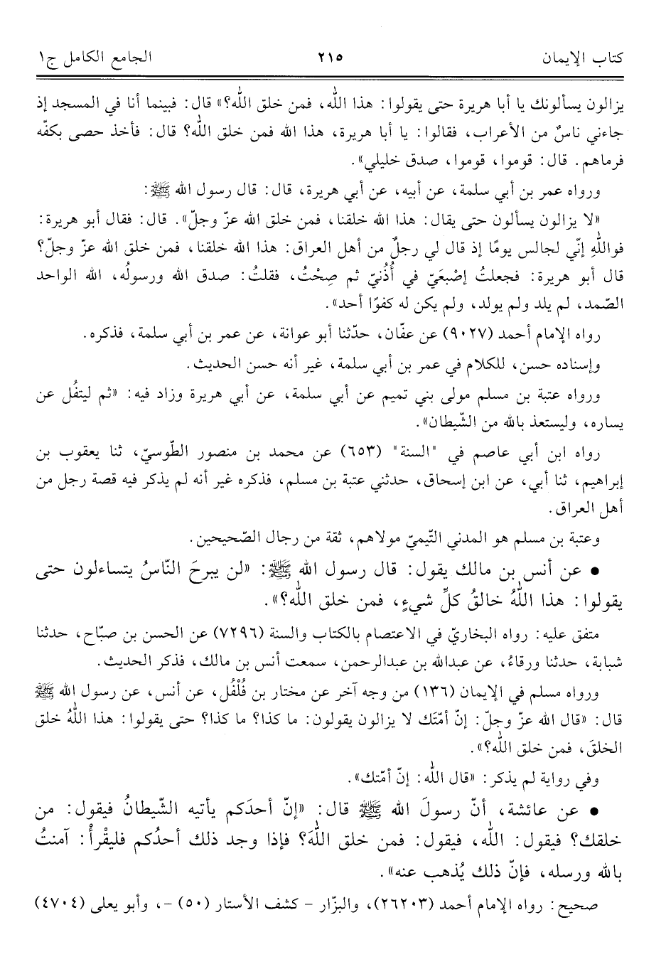 • عن أنس بن مالك يقول: قال رسول اللَّه -صلى اللَّه عليه وسلم-: "لن يبْرحَ النّاسُ يتساءلون حتى يقولوا: هذا اللَّهُ خالقُ كلِّ شيءٍ، فمن خلق اللَّه؟ ".