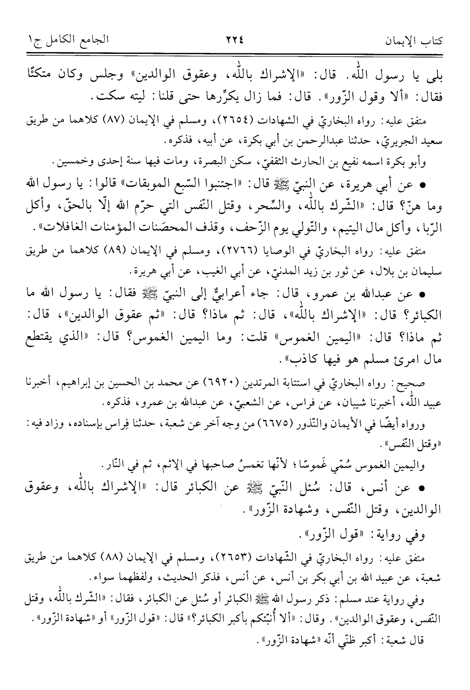 • عن أنس، قال: سُئل النّبيّ -صلى اللَّه عليه وسلم- عن الكبائر قال: "الإشراك باللَّه، وعقوق الوالدين، وقتل النّفس، وشهادة الزّور".