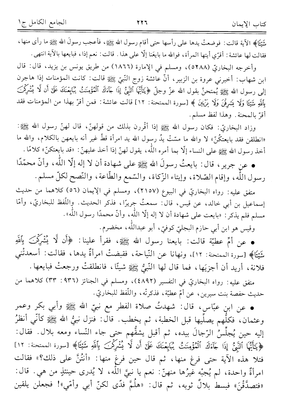 • عن ابن عبّاس، قال: شهدتُ صلاة الفطر مع نبيّ اللَّه -صلى اللَّه عليه وسلم- وأبي بكر وعمر وعثمان، فكلُّهم يصلِّيها قبل الخطبة، ثم يخطب. قال: فنزل نبيُّ اللَّه -صلى اللَّه عليه وسلم- كأنّي أنظرُ إليه حين يُجلِّسُ الرّجالَ بيده، ثم أقبل يشقُّهم حتى جاء النّساء ومعه بلال. فقال: {يَاأَيُّهَا النَّبِيُّ إِذَا جَاءَكَ الْمُؤْمِنَاتُ يُبَايِعْنَكَ عَلَى أَنْ لَا يُشْرِكْنَ بِاللَّهِ شَيْئًا} [سورة الممتحنة: ١٢] فتلا هذه الآية حتى فرغ منها، ثم قال حين فرغ منها: "أنتُنَّ على ذلك؟ " فقالت امرأةٌ واحدة، لم يُجبْه غيرُها منهنّ: نعم يا نبيَّ اللَّه، لا يُدري حينئذٍ من هي. قال: "فتصدَّقْنَ" فبسط بلالٌ ثوبه، ثم قال: "هلُمَّ فدًى لكنّ أبي وأمّي"! فجعلن يلقين
