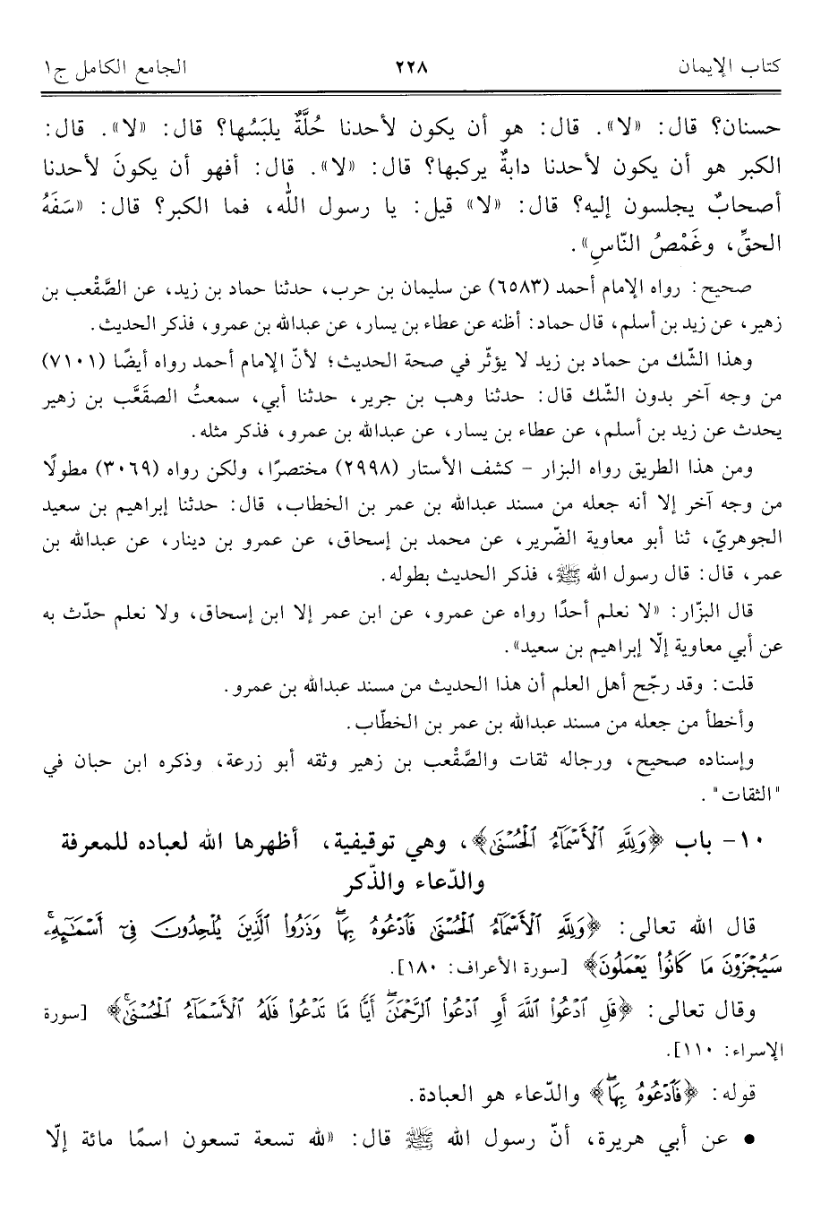 حسنان؟ قال: "لا". قال: هو أن يكون لأحدنا حُلَّةٌ يلبَسُها؟ قال: "لا". قال: الكبر هو أن يكون لأحدنا دابةٌ يركبها؟ قال: "لا". قال: أفهو أن يكونَ لأحدنا أصحابٌ يجلسون إليه؟ قال: "لا" قيل: يا رسول اللَّه، فما الكبر؟ قال: "سَفَهُ الحقِّ، وغَمْصُ النّاسِ".