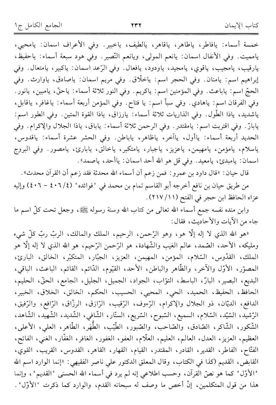 "هو اللَّه الذي لا إله إلّا هو، وهو الرّحمن , الرحيم، الملك والمالك، الربّ ربّ كلّ شيء ومليكه، الأحد، الصّمد، عالم الغيب والشّهادة، هو الرّحمن الرّحيم، هو اللَّه الذي لا إله إلّا هو الملك، القدّوس، السّلام، المؤمن، المهيمن، العزيز، الجبّار، المتكبّر، الخالق، البارئ، المصوّر, الأوّل والآخر، والظّاهر والباطن، الأحد، القيّوم، الدّائم، القائم، الباعث، الباقي، البديع، البصير، البارّ، الباسط، التوّاب، الجواد، الجميل، الجليل، الجامع، الحقّ، الحليم، الحافظ، الحفيظ، الحميد، الحي، المحيي، الحسيب، الحكم، الخالق، الخلاق، الخبير، الدافع، الديّان، ذو الجلال والإكرام، الرّءوف، الرّقيب، الرّازق، الرزّاق، الرّافع، والرّفيق، الرّشيد، السّيد، السّلام، السميع، السّبوح، السّريع، الستّار، الشّافي، الشّديد، الشّهيد، الشّاهد، الشّكور، الشّاكر، الصّادق، والصّاحب، والصّبور، الطّيّب، الظُّهَر، الطّاهر، العلي، الأعلى، العظيم، العزيز، العدل، العالم، العليم، العلّام، العفو، الغفور، الغافر، الغفّار، الغني، الفاتح، الفتّاح، الفاطر، القدير، القادر، المقتدر، القيام، القهار، القاهر، القدوس، القريب، القوي، القابض، القديم (كذا في الكتاب، وقال المعلق الدكتور علي ناصر الفقيهي: "إنما الوارد اسم اللَّه "الأوّل" كما هو نصّ القرآن، وحسب اطلاعي إنه لم يرد في أسماء اللَّه الحسنى "القديم"، وإنما هذا من قول المتكلمين، إنّ أخص ما وصف له سبحانه القدم، والوارد كما ذكرت "الأوّل".