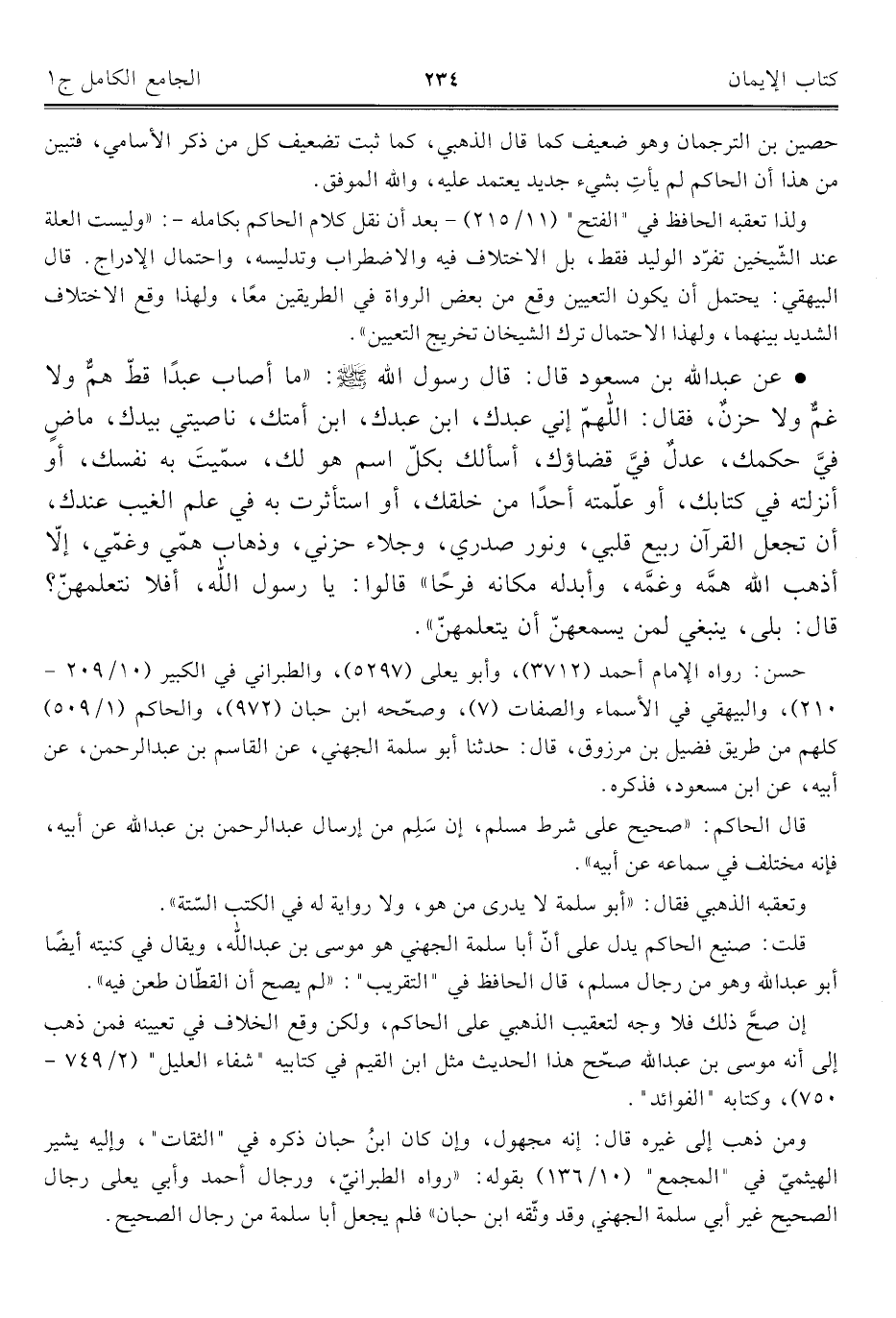 حسن: رواه الإمام أحمد (٣٧١٢)، وأبو يعلى (٥٢٩٧)، والطبراني في الكبير (١٠/ ٢٠٩ - ٢١٠)، والبيهقي في الأسماء والصفات (٧)، وصحّحه ابن حبان (٩٧٢)، والحاكم (١/ ٥٠٩) كلهم من طريق فضيل بن مرزوق، قال: حدثنا أبو سلمة الجهني، عن القاسم بن عبد الرحمن، عن أبيه، عن ابن مسعود، فذكره.