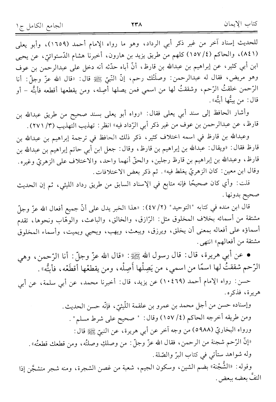 • عن أبي هريرة، قال: قال رسول اللَّه -صلى اللَّه عليه وسلم-: "قال اللَّه عزّ وجلّ: أنا الرّحمن، وهي الرّحم شققتُ لها اسمًا من اسمي، من يَصِلْها أَصِلْه، ومن يقطعْها أقطَعْه، فأبتُّه".