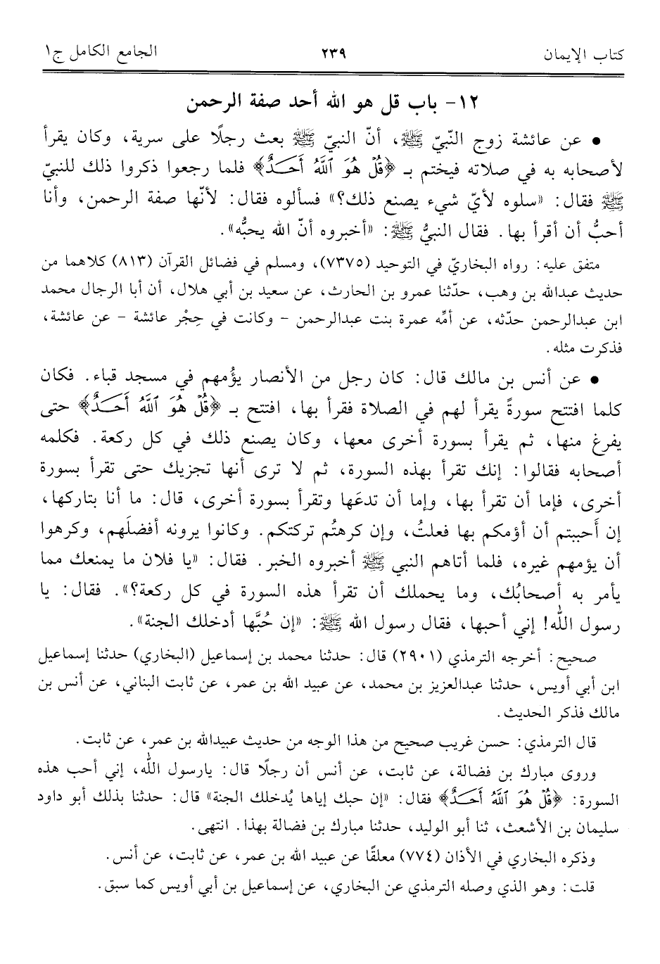 • عن أنس بن مالك قال: كان رجل من الأنصار يؤُمهم في مسجد قباء. فكان كلما افتتح سورةً يقرأ لهم في الصلاة فقرأ بها، افتتح بـ {قُلْ هُوَ اللَّهُ أَحَدٌ} حتى يفرغ منها، ثم يقرأ بسورة أخرى معها، وكان يصنع ذلك في كل ركعة. فكلمه أصحابه فقالوا: إنك تقرأ بهذه السورة، ثم لا ترى أنها تجزيك حتى تقرأ بسورة أخرى، فإما أن تقرأ بها، وإما أن تدعَها وتقرأ بسورة أخرى، قال: ما أنا بتاركها، إن أَحببتم أن أؤمكم بها فعلتُ، وإن كرهتُم تركتكم. وكانوا يرونه أفضلَهم، وكرهوا أن يؤمهم غيره، فلما أتاهم النبي -صلى اللَّه عليه وسلم- أخبروه الخبر، فقال: "يا فلان ما يمنعك مما يأمر به أصحابُك، وما يحملك أن تقرأ هذه السورة في كل ركعة؟ ". فقال: يا رسول اللَّه! إني أحبها، فقال رسول اللَّه -صلى اللَّه عليه وسلم-: "إن حُبَّها أدخلك الجنة".