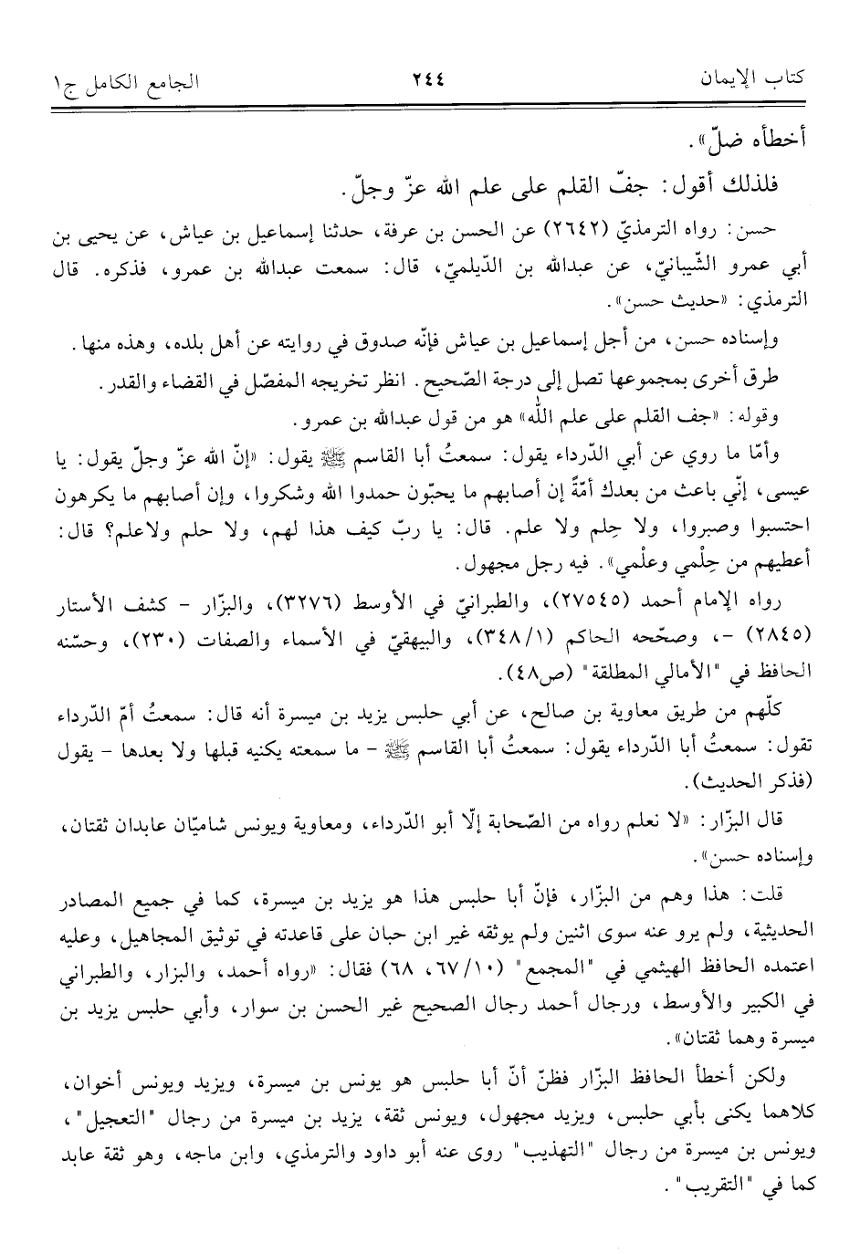 وأمّا ما روي عن أبي الدّرداء يقول: سمعتُ أبا القاسم -صلى اللَّه عليه وسلم- يقول: "إنّ اللَّه عزّ وجلّ يقول: يا عيسى، إنّي باعث من بعدك أمّةٌ إن أصابهم ما يحبّون حمدوا اللَّه وشكروا، وإن أصابهم ما يكرهون احتسبوا وصبروا، ولا حِلم ولا علم. قال: يا ربّ كيف هذا لهم، ولا حلم ولا علم؟ قال: أعطيهم من حِلْمي وعلْمي". فيه رجل مجهول.