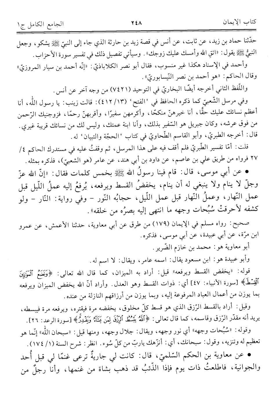 • عن أبي موسى، قال: قام فينا رسولُ اللَّه -صلى اللَّه عليه وسلم- بخمس كلمات فقال: "إنّ اللَّه عزّ وجلّ لا ينام ولا ينبغي له أن ينام، يخفضُ القسط ويرفعه، يُرفعُ إليه عملُ اللّيل قبل عمل النّهار، وعملُ النّهار قبل عمل اللّيل، حجابُه النّور -وفي رواية: النّار- ولو كشفه لأحرقت سُبُحات وجهه ما انتهى إليه بصرُه من خلقه".