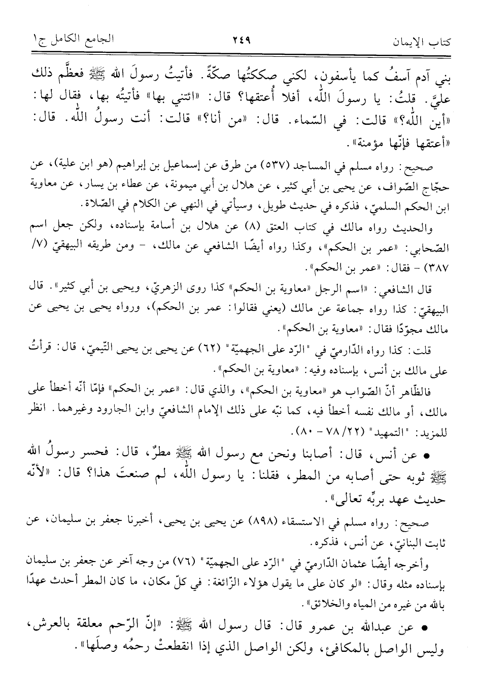 بني آدم آسفُ كما يأسفون، لكني صككتُها صكّةً. فأتيتُ رسول اللَّه -صلى اللَّه عليه وسلم- فعظَّم ذلك عليَّ. قلتُ: يا رسول اللَّه، أفلا أُعتقها؟ قال: "ائتني بها" فأتيتُه بها، فقال لها: "أين اللَّه؟ " قالت: في السّماء. قال: "من أنا؟ " قالت: أنت رسولُ اللَّه. قال: "أعتقها فإنها مؤمنة".