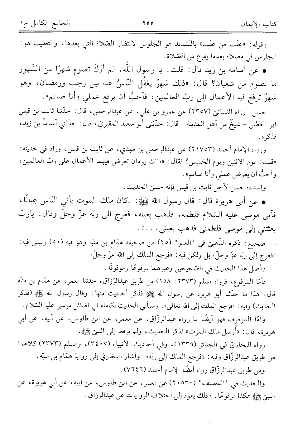 • عن أسامة بن زيد قال: قلت: يا رسول اللَّه، لم أرَكَ تصوم شهرًا من الشّهور ما تصوم من شعبان؟ قال: "ذلك شهرٌ يغفُل النّاسُ عنه بين رجب ورمضان، وهو شهرٌ ترفع فيه الأعمال إلى ربّ العالمين، فأحبُّ أن يرفع عملي وأنا صائم".