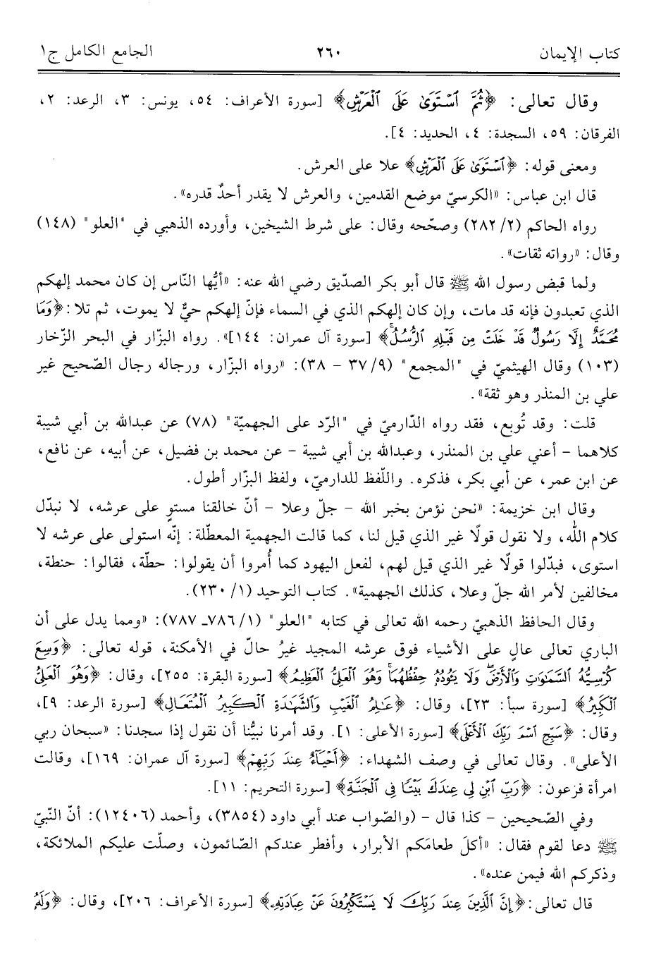 وقال الحافظ الذهبيّ رحمه اللَّه تعالى في كتابه "العلو" (١/ ٧٨٦ - ٧٨٧): "ومما يدل على أن الباري تعالى عالٍ على الأشياء فوق عرشه المجيد غيرُ حالّ في الأمكنة، قوله تعالى: {وَسِعَ كُرْسِيُّهُ السَّمَاوَاتِ وَالْأَرْضَ وَلَا يَئُودُهُ حِفْظُهُمَا وَهُوَ الْعَلِيُّ الْعَظِيمُ} [سورة البقرة: ٢٥٥]، وقال: {وَهُوَ الْعَلِيُّ الْكَبِيرُ} [سورة سبأ: ٢٣]، وقال: {عَالِمُ الْغَيْبِ وَالشَّهَادَةِ الْكَبِيرُ الْمُتَعَالِ} [سورة الرعد: ٩]، وقال: {سَبِّحِ اسْمَ رَبِّكَ الْأَعْلَى} [سورة الأعلى: ١]. وقد أمرنا نبيُّنا أن نقول إذا سجدنا: "سبحان ربي الأعلى". وقال تعالى في وصف الشهداء: {أَحْيَاءٌ عِنْدَ رَبِّهِمْ} [سورة آل عمران: ١٦٩]، وقالت امرأة فرعون: {رَبِّ ابْنِ لِي عِنْدَكَ بَيْتًا فِي الْجَنَّةِ} [سورة التحريم: ١١].