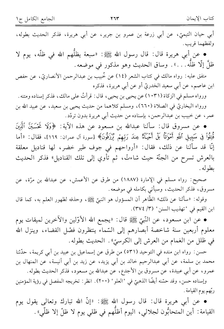 • عن أبي هريرة قال: قال رسول اللَّه -صلى اللَّه عليه وسلم-: "سبعة يظلُّهم اللَّه في ظلّه، يوم لا ظلَّ إلّا ظلُّه. . . ". وساق الحديث وهو مذكور في موضعه.