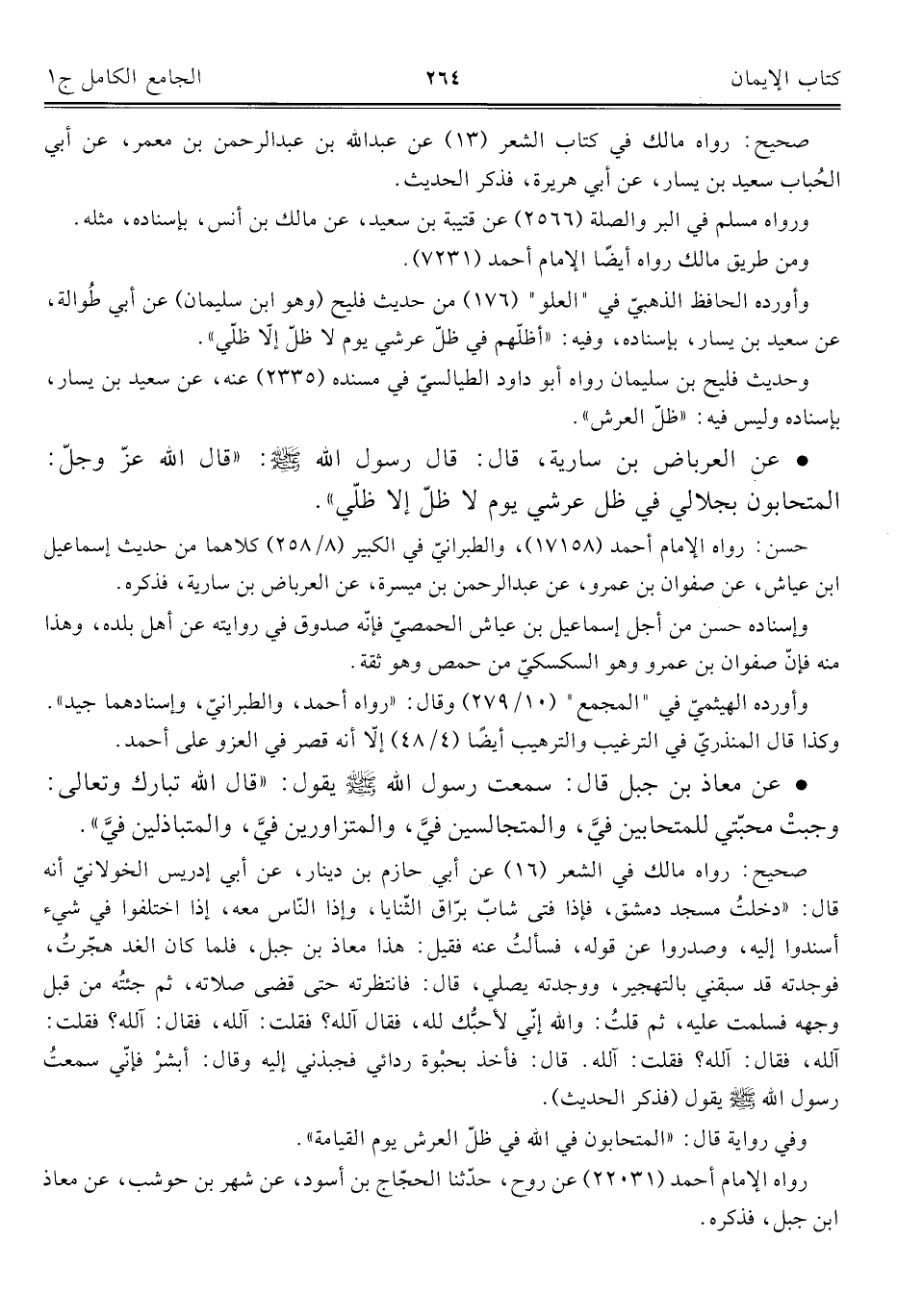 • عن العرباض بن سارية، قال: قال رسول اللَّه -صلى اللَّه عليه وسلم-: "قال اللَّه عزّ وجلّ: المتحابون بجلالي في ظل عرشي يوم لا ظلّ إلا ظلّي".