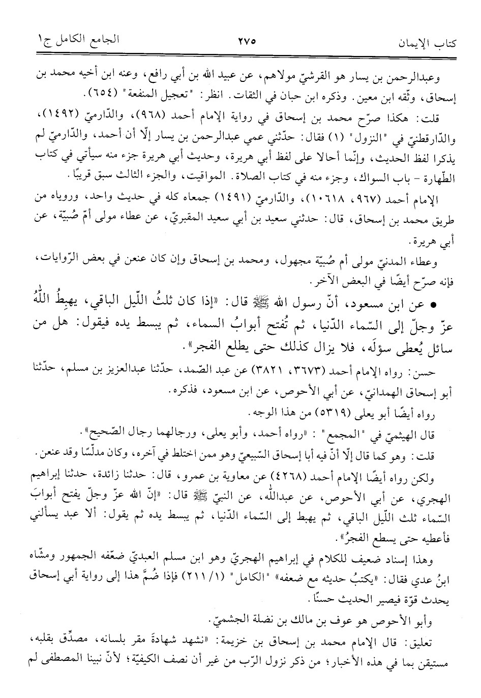 تعليق: قال الإمام محمد بن إسحاق بن خزيمة: "نشهد شهادةَ مقر بلسانه، مصدِّق بقلبه، مستيقن بما في هذه الأخبار؛ من ذكر نزول الرّب من غير أن نصف الكيفيّة؛ لأنّ نبينا المصطفى لم