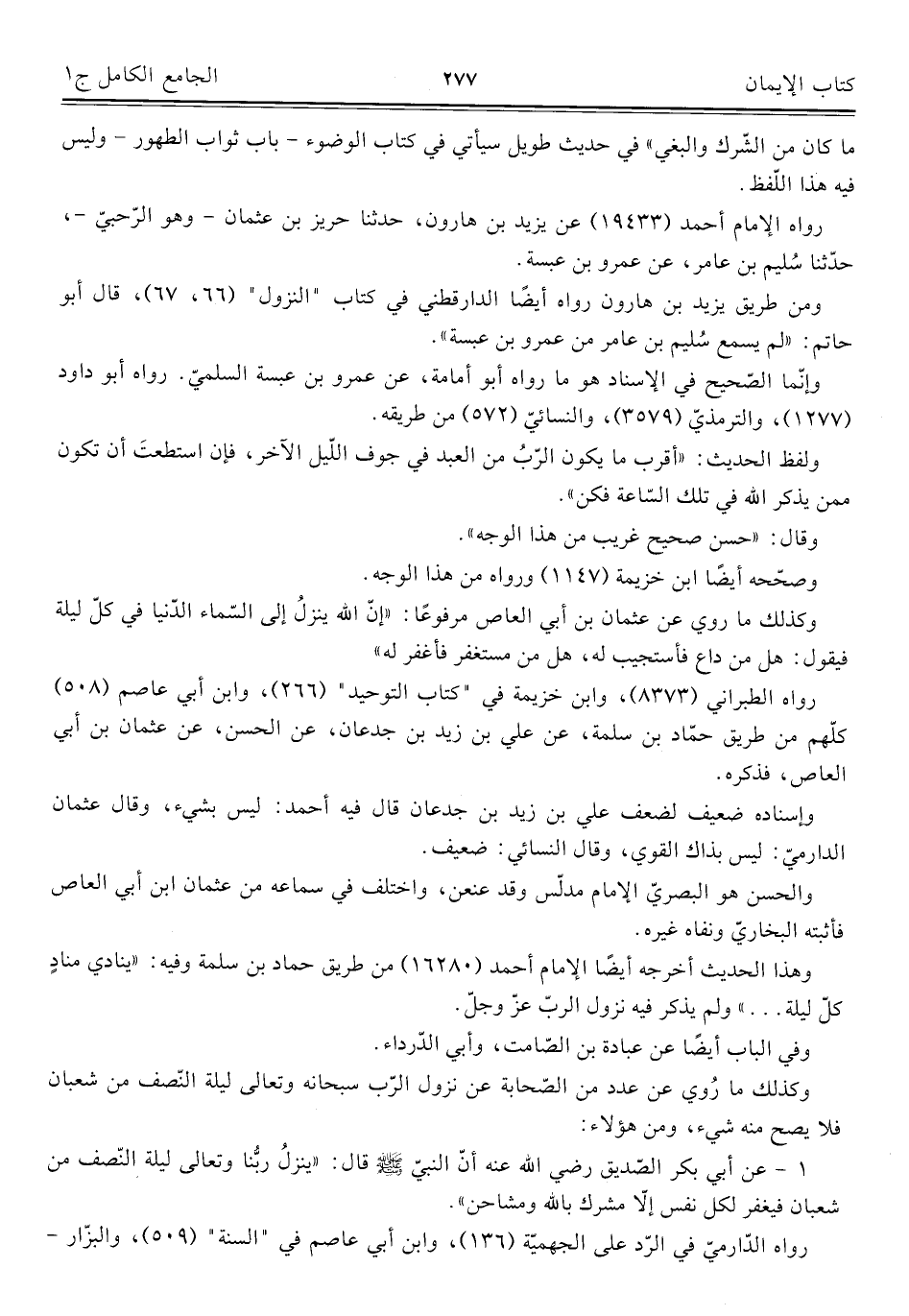 ١ - عن أبي بكر الصديق رضي اللَّه عنه أنّ النبيّ -صلى اللَّه عليه وسلم- قال: "ينزلُ ربُّنا وتعالى ليلة النّصف من شعبان فيغفر لكل نفس إلّا مشرك باللَّه ومشاحن".